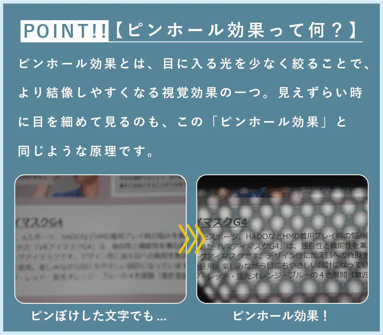 裸眼の状態でもしっかりくっきり手元の文字がよく見える「ピンホール効果」。目の前にあるメッシュ生地の小さな穴越しに見ることでよく見える+温めるを実現したのが人気の秘密!老眼鏡やコンタクトレンズをしなくても見えることで、たとえ寝落ちしても電気を使わないから安心安全に使えます!
