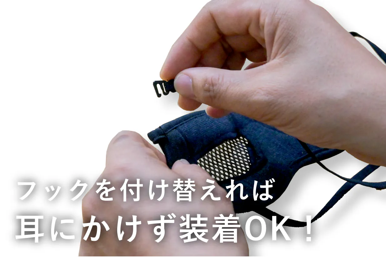 今までも特に要望が多かったバックゴム仕様の便利さ。今回は新アイデアとして耳ヒモのスナップを付け替えることができる2way仕様に変更。通常の「耳掛け仕様」から頭の後ろに回して装着できる「バックゴム仕様」が可能になりました。ご利用シーンに応じて変更できます(実用新案)