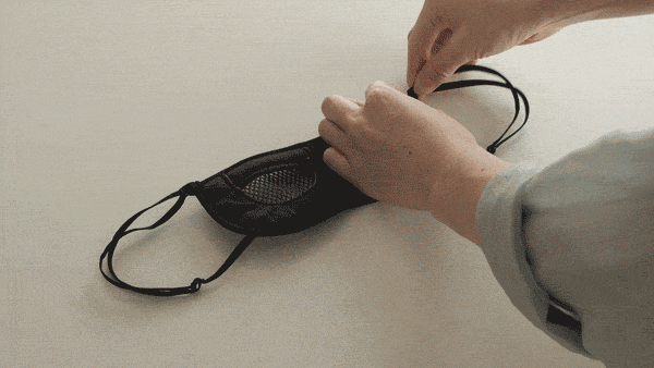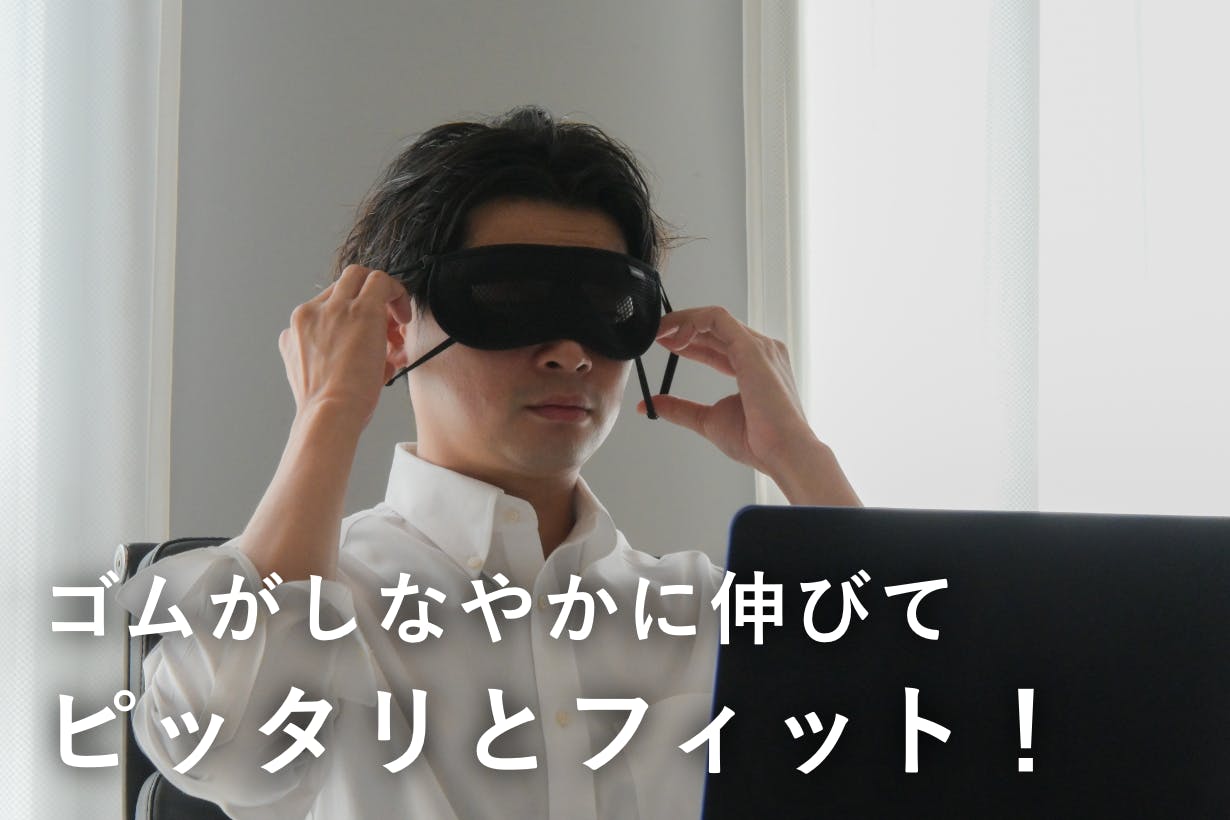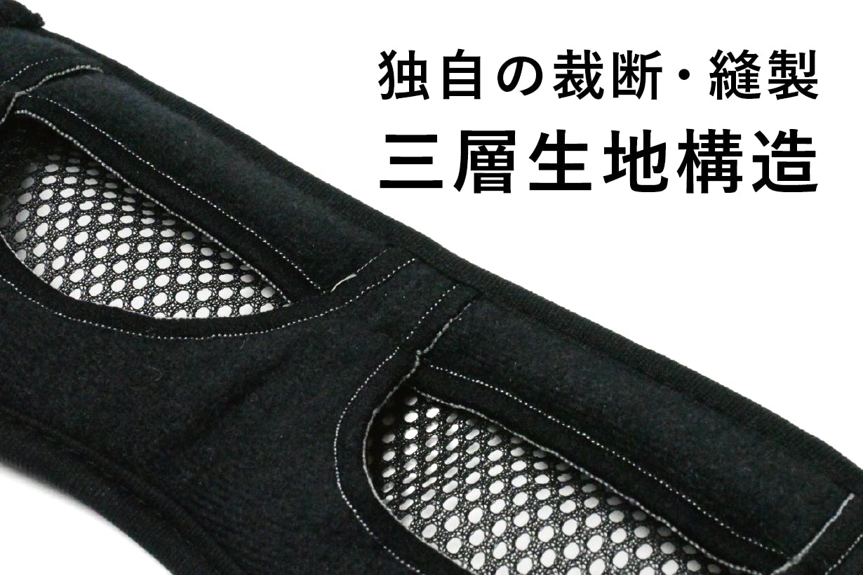 特殊な内部の立体構造と特殊な立体縫製で特許を出願。製法で一番苦労したのが瞬きの邪魔をしないこと。平面布地を3層に重ねることで完成したことで違和感なく装着できます。目の周辺に沿うように少し湾曲しやすくしたことも計算の一つ。弊社のこだわりはそんな見えないところも工夫しています。
