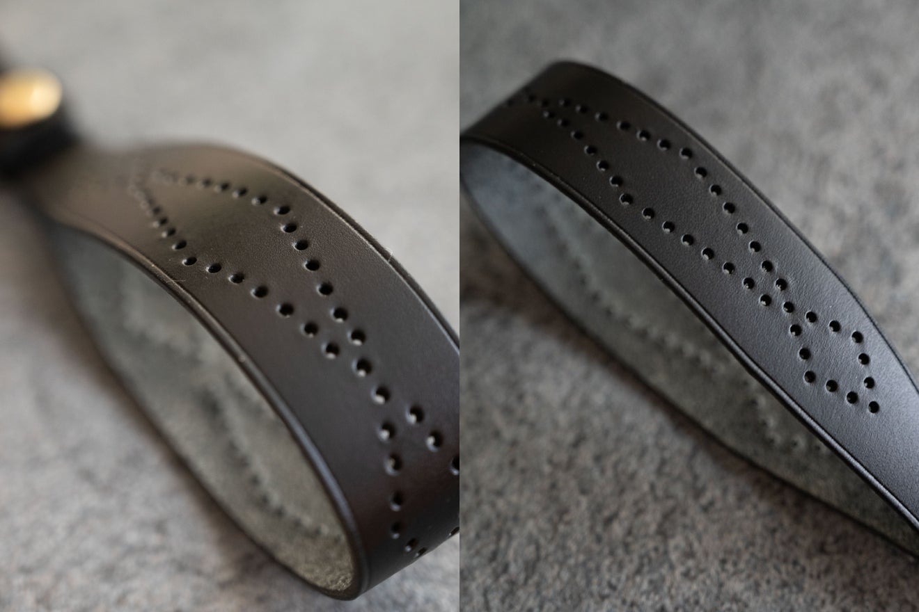 レザーベルト部分には一つ一つ手作業でパンチング模様を打ち込んでいます。