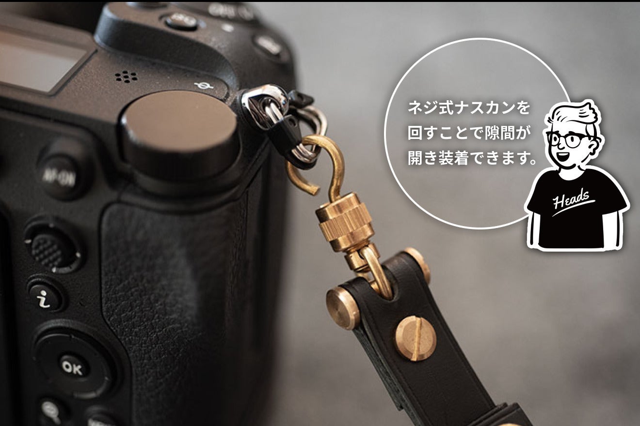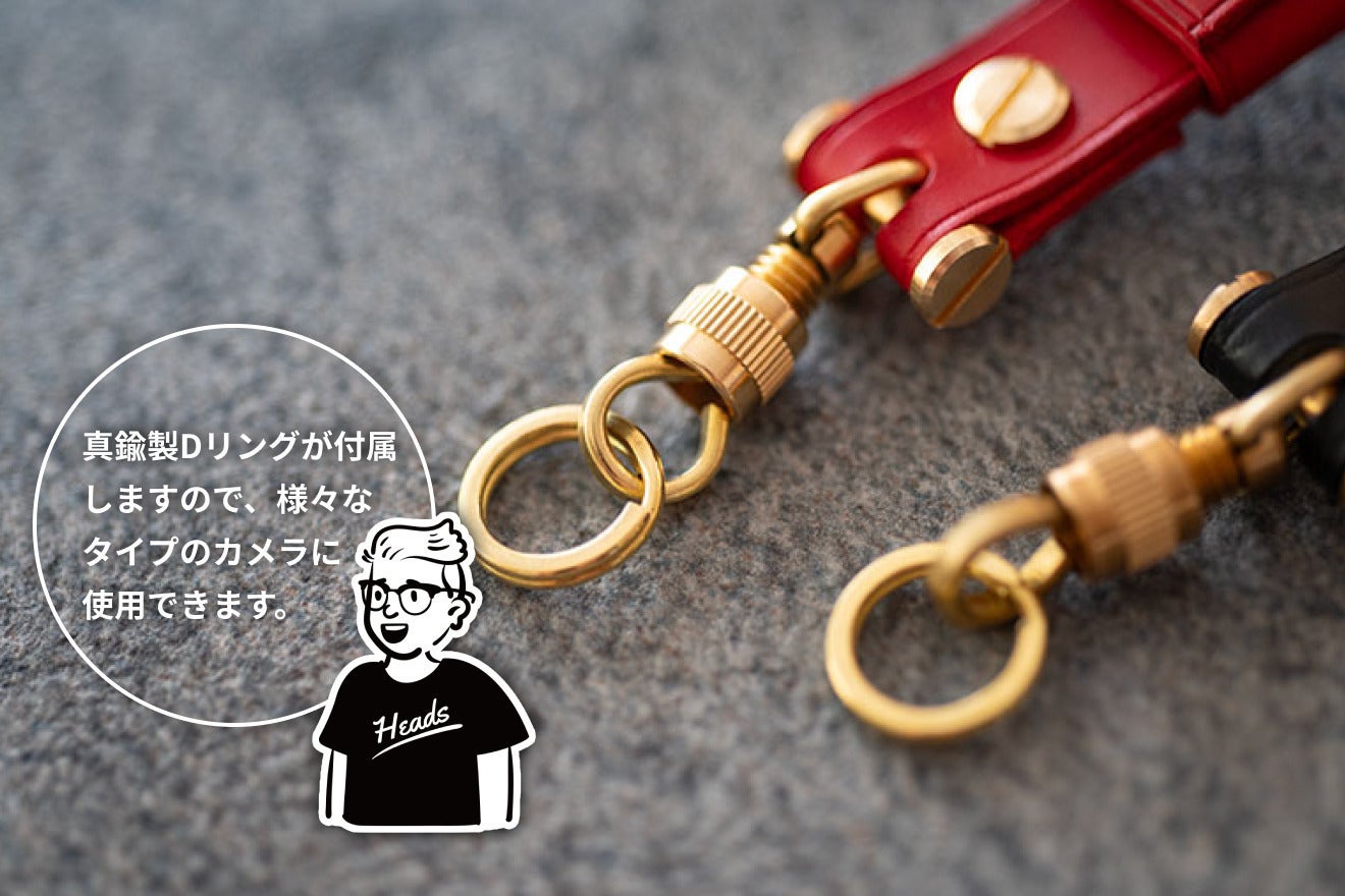 一般的なカメラに備わっている三角リングタイプの場合は、直接ネジ式金具を取り付け可能です。また、ネジ式金具の先には15mmの真鍮リングが付属しますので、スクリュータイプのDリング付きタイプでも装着可能です。