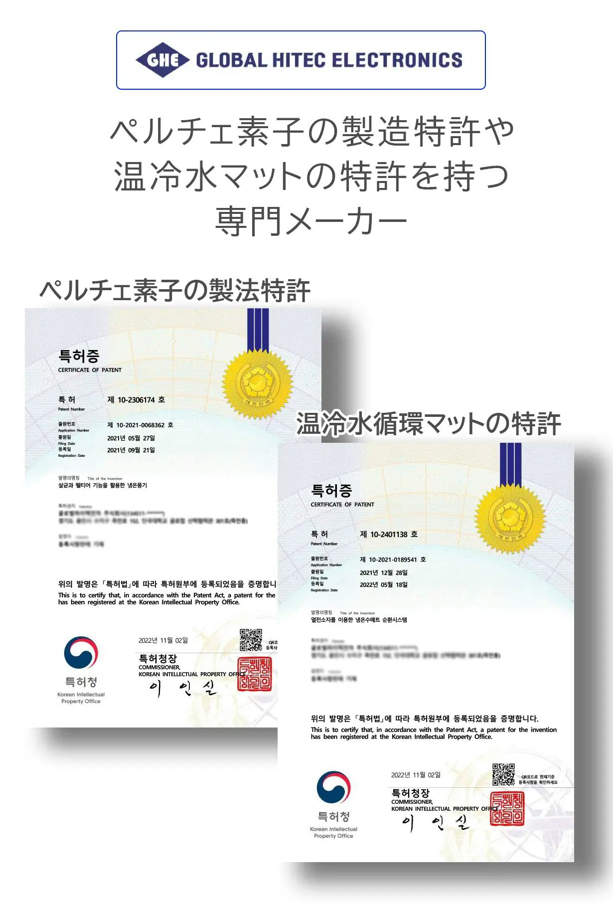 温冷水マットはグローバルハイテック電子社の製品です。同社はカー用品部品の開発を行う大手メーカーからその技術を利用したコンシューマー製品を企画販売するべく生まれた会社です。そのため、海外で数多くのパテントを所有しており、この温冷水マットもパテント技術が数多く使われています。中でもカー用品でも使われるペルチェ素子については製造特許をもっており、その特性と開発力は優れた製品技術を持っています。