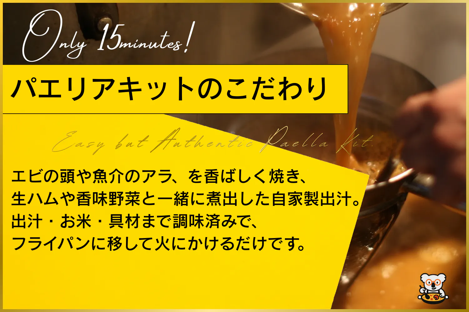 ●エビの頭や魚介のアラを香ばしく焼き、香味野菜と一緒に煮出した出汁を使う「海の幸パエリア」
