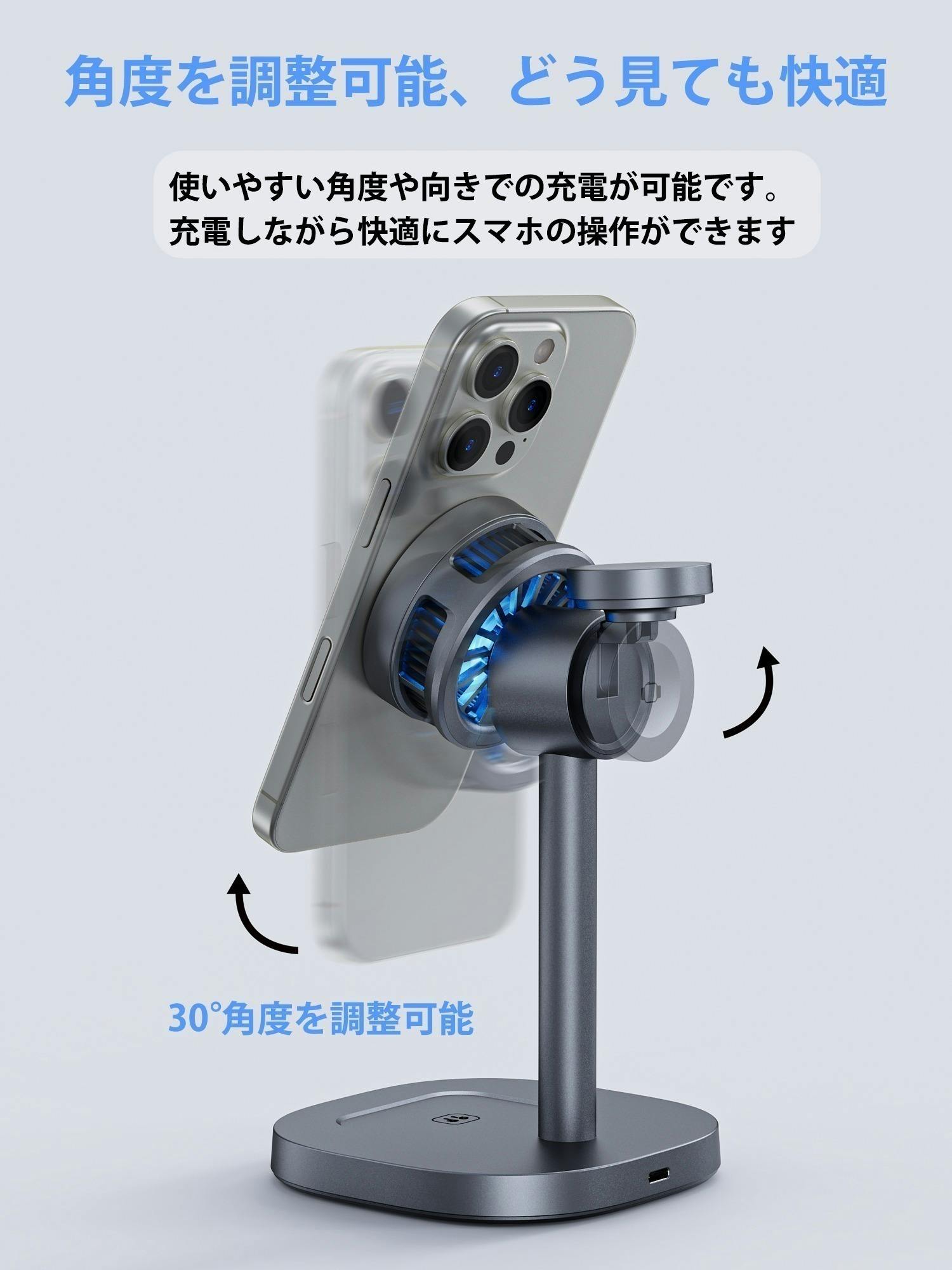 ① ペルチェ効果×冷却ファンのW冷却でスマホ充電中も熱対策万全!② Qi2認証取得!Apple製品3台同時充電対応の3-in-1磁気ワイヤレス充電器。③ 折り畳み式ウォッチ台&30度調整可能スマホスタンドで使いやすさ◎