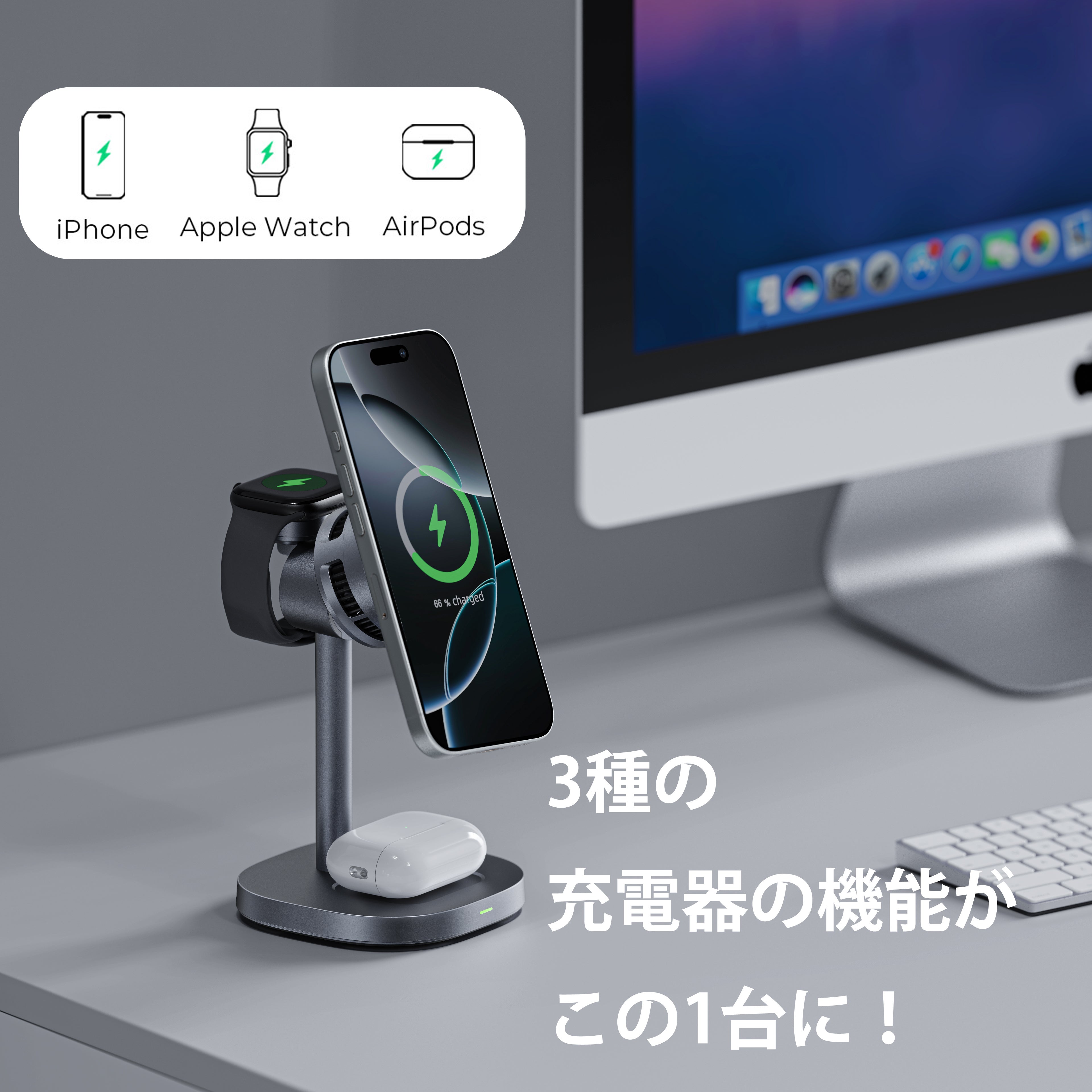 3台の充電器の機能がこの1台に。Qi対応iPhoneシリーズ、AirPodsなどのワイヤレスイヤホン、Apple Watchの3台の同時充電が可能です。