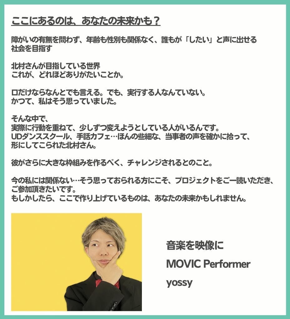 2025/08/01 16:50「「したいができる世界を。」手話とダンスで世界をつなぐ映像制作プロジェクト」プロジェクトオーナーの北村仁です。クラウドファンディングへのご支援をいただいた皆様、本当にありがとうございました。85万円ものご支援を賜り、感謝の念に堪えません。目標金額には到達しませんでしたが、皆様の想いを形にするべく、映像制作を実行することを決定いたしました。素晴らしいクリエイターチームにも恵まれ、本日キックオフミーティングを終えたところです。 撮影などの進捗は後日、僕のSNSでも報告します。今後ともどうぞよろしくお願いいたします。本当にありがとうございました。 もっと見る
