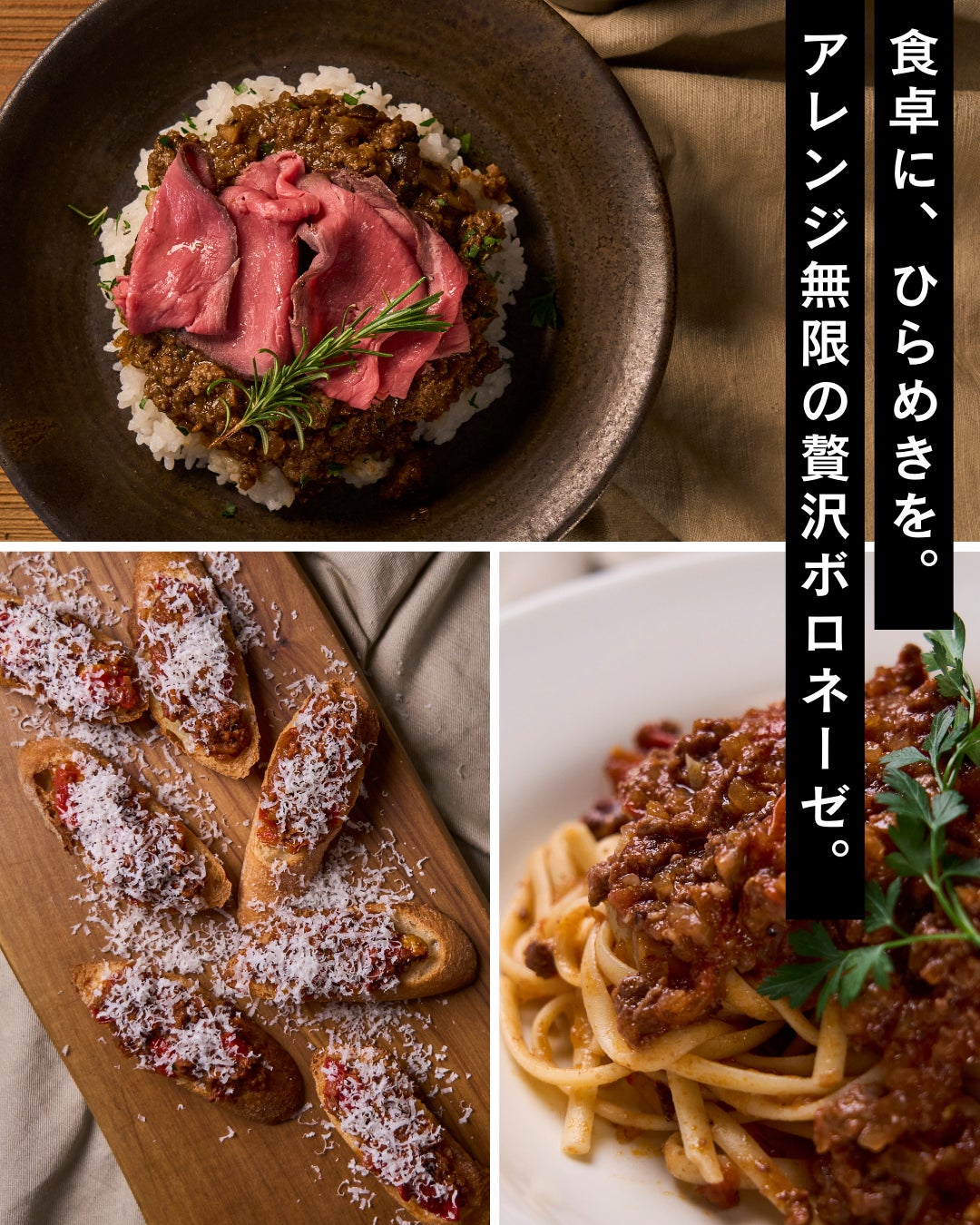 重くなりがちな調味料も、あえて控えめに使うことで、野菜と牛肉それぞれの持ち味をしっかり引き出しました。その結果、どんな食材とも相性がよく、アレンジの幅が広い、“軽やかさとコク”を両立した万能ミートソースが完成しました。