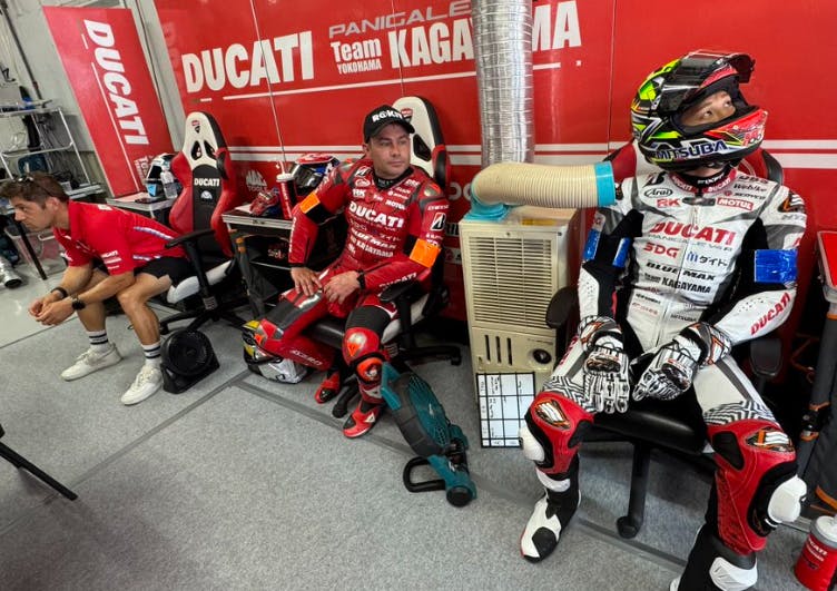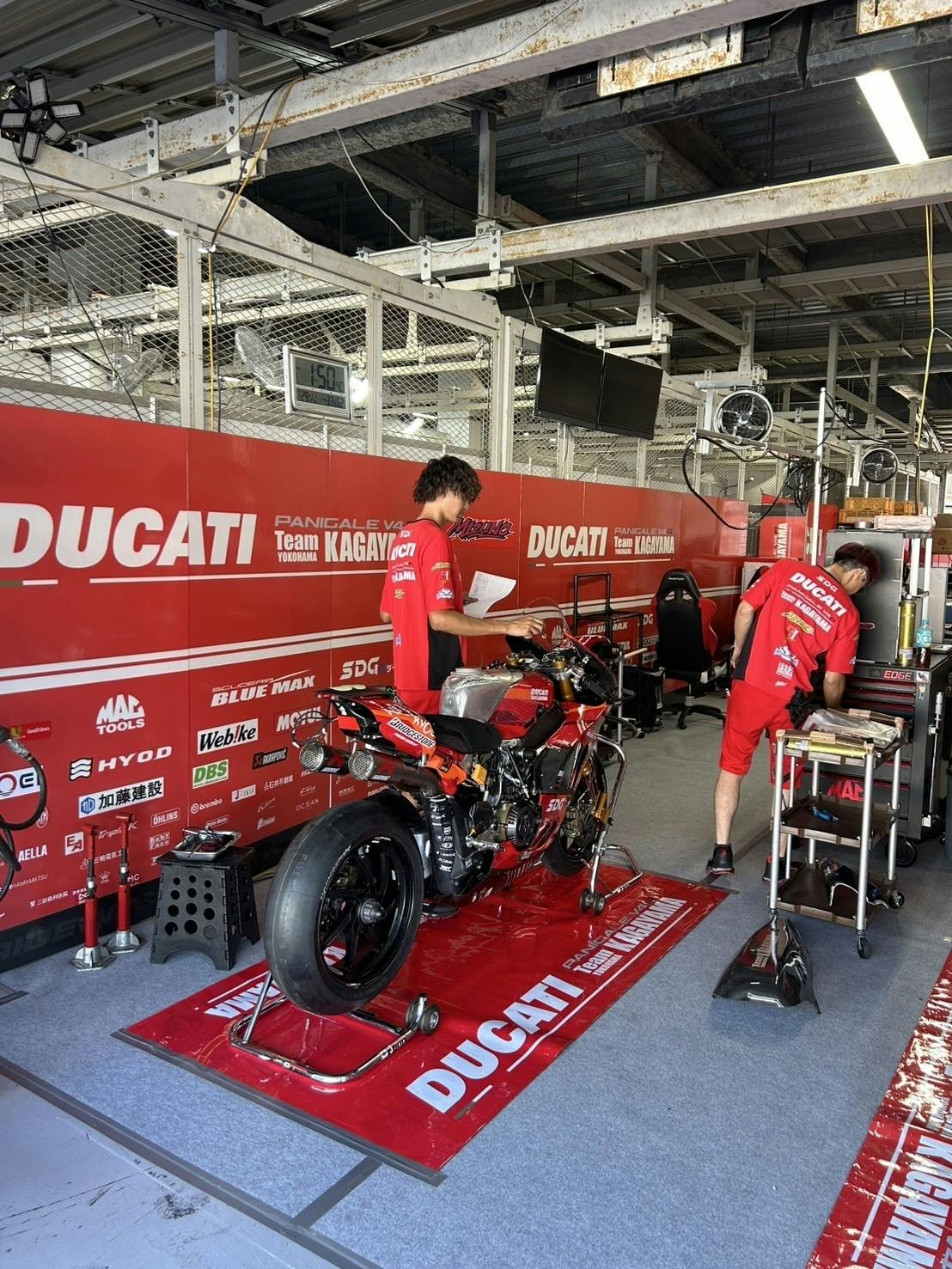 ピットエリアはDUCATI Team KAGAYAMAのカラーで彩られ