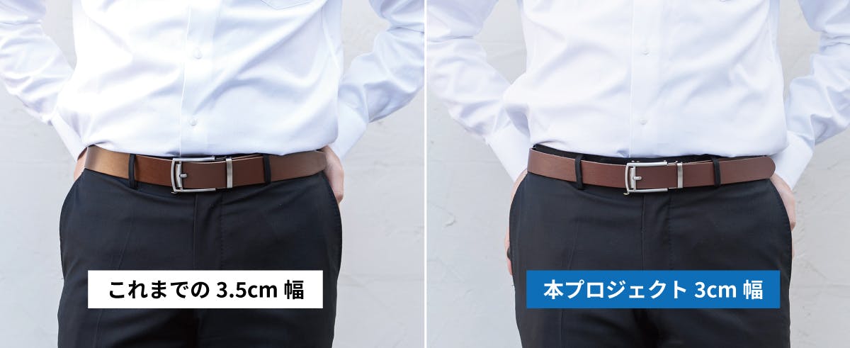 これまでのプロジェクトではベルトを毎日使っていただきたい想いから「ON・OFF」兼用を重視した3.5cm幅のベルトを作成しておりました。