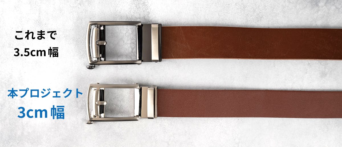 ご購入者さまから「ビジネスで使うにはもう少し細幅のほうがよかった」、購入前のご相談では「スーツに使うことが多いので細い幅はありますか?」「女性用でも使える細いベルトはないですか?」と、細い幅をお求めいただく声が非常に多く、実際にビジネスベルトでは3cm幅が主流となっているので、今回はより「ONモード」に特化した3cm幅のナロータイプをご提案することにしました。