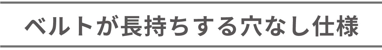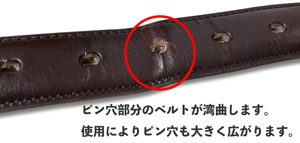 ピンタイプのバックルを使用したベルトは「ベルト穴で調整」のため2.5cm / 1インチ単位での調整となります。これだと緩めるとゆるゆるになってしまいますよね。また使用頻度によりベルト穴部分が劣化します。