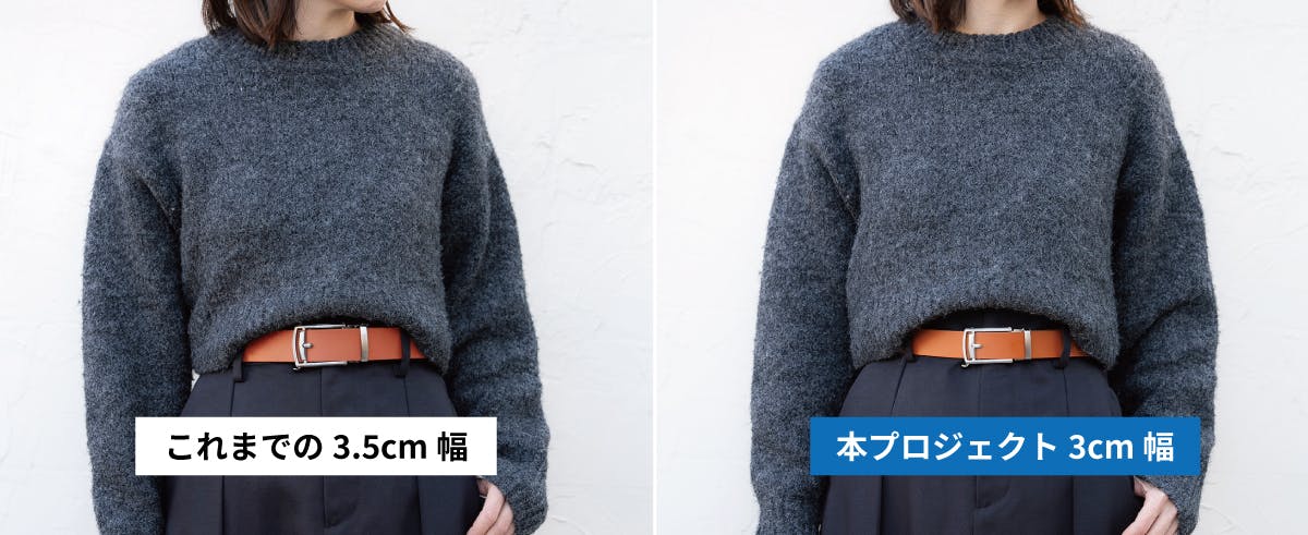 これまでのプロジェクトではベルトを毎日使っていただきたい想いから「ON・OFF」兼用を重視した3.5cm幅のベルトを作成しておりました。