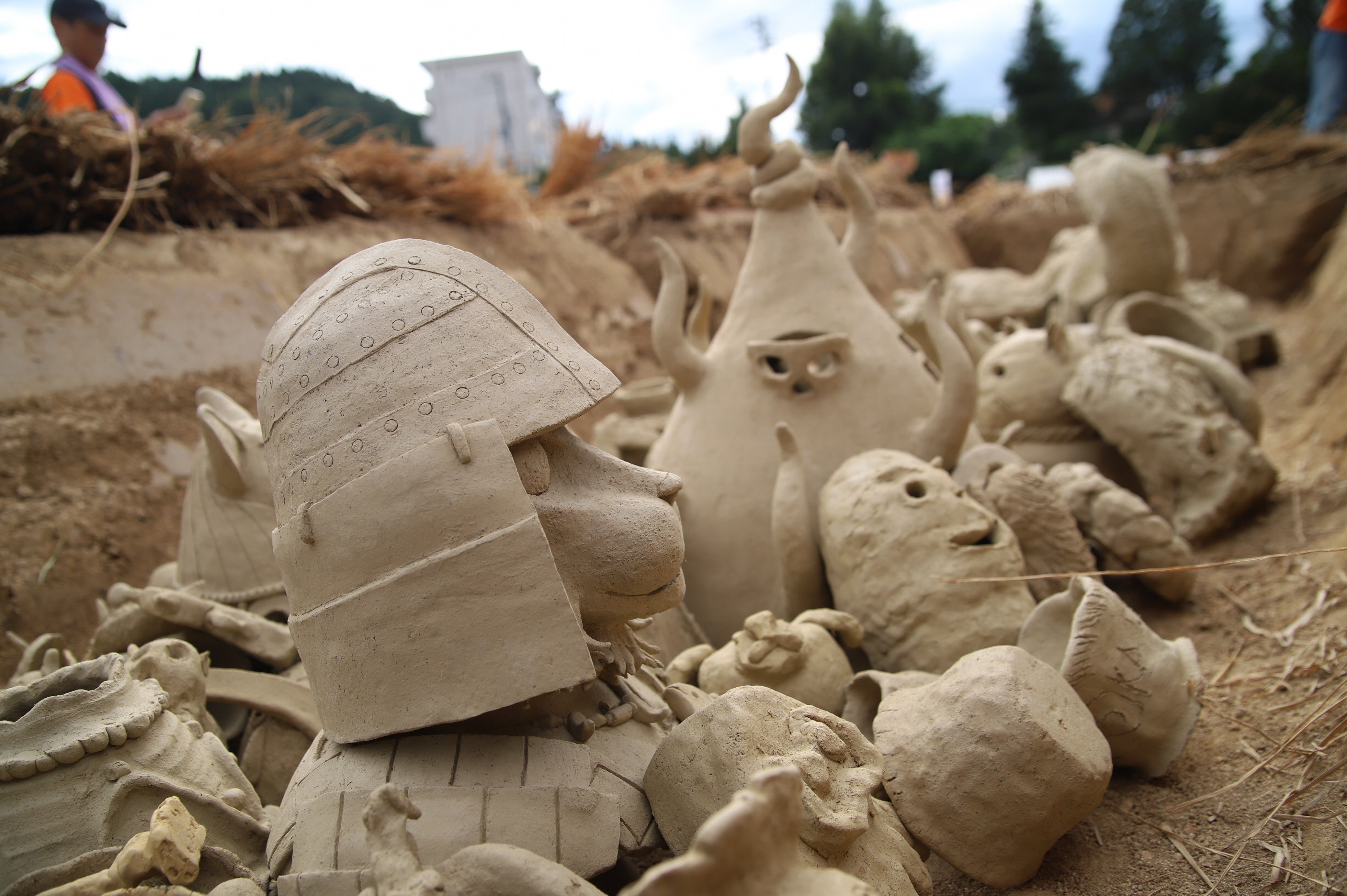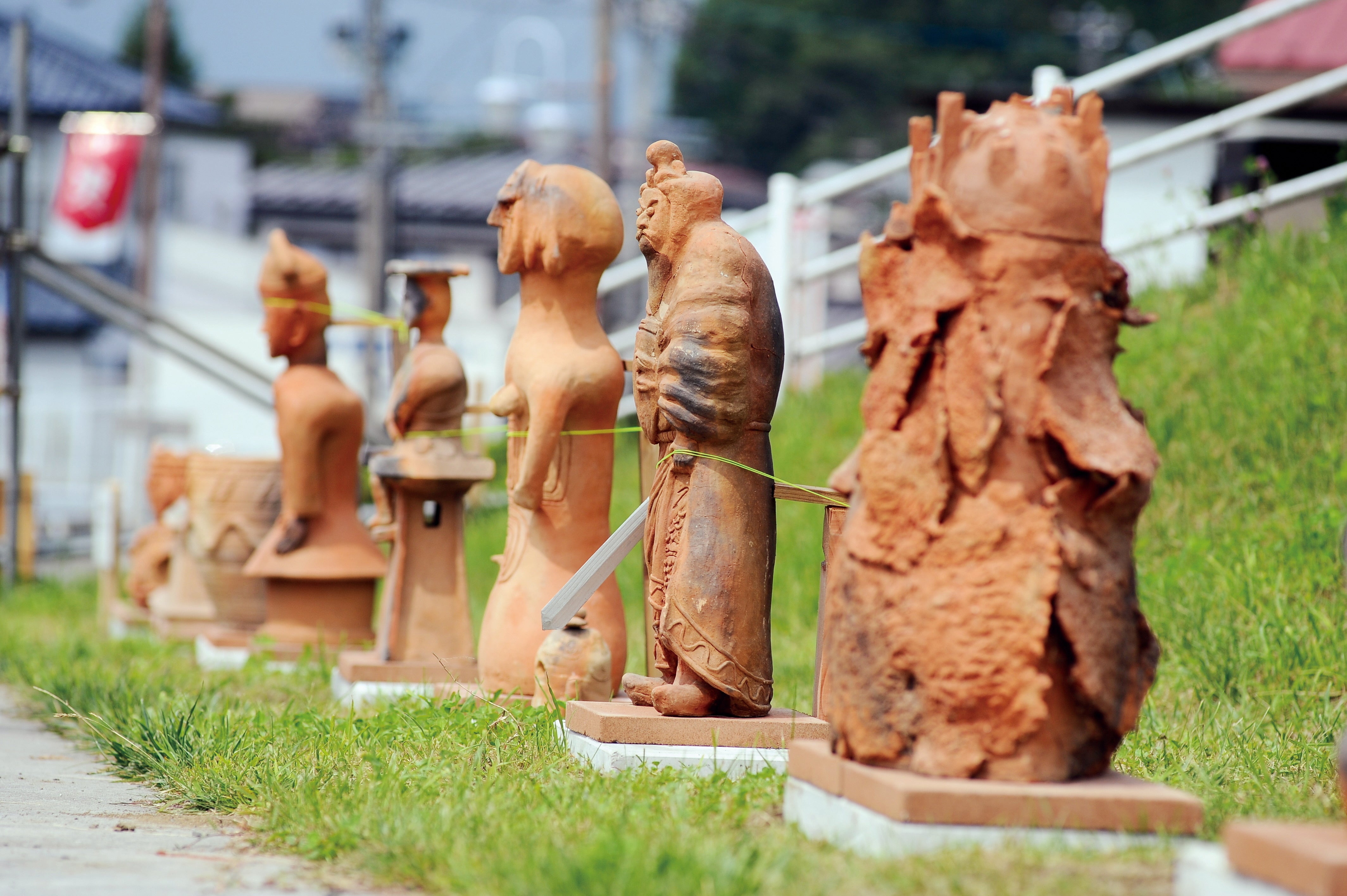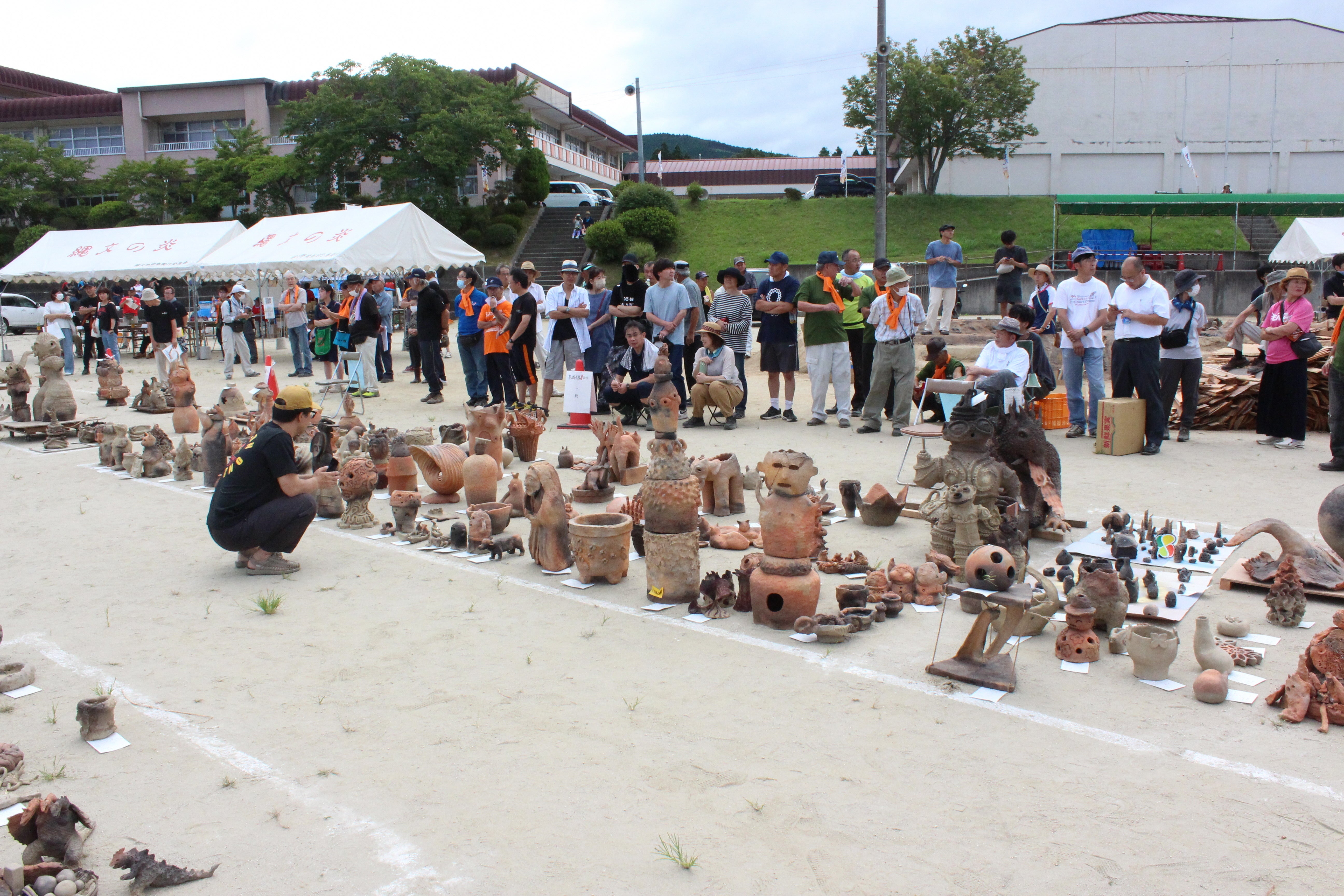 今から49年前の昭和51(1976)年、東京都あきる野市の考古学者で陶芸家の塩野半十郎氏(故人)が岩手県藤沢町で古代縄文式野焼きを復元した祭りを提唱し、当時、藤沢町で活動していた藤沢焼の窯元らが中心となって第1回が開催されました。当時の藤沢町は急激に過疎化が進行し、「人口の流出だけでなく、町民が地域への誇りや希望まで失ってしまう“心の過疎„になってはいけない」「人を呼び感動できる祭りはできないものか」と模索。そうした中で「祭りを地域活性化のバネにしよう」と地域、住民、行政の協働による新しいまちづくりが始まりました。その時に灯された「古里再生の炎」が今なお燃やし続けられています。また、平成2(1990)年の第15回藤沢野焼祭に参加した岡本太郎氏(故人)は祭りと藤沢町の人たちの取り組みに感動し「ここには縄文人がたくさんいる。縄文の原点が藤沢であってほしい」と絶賛し、氏の作品ブロンズ像「縄文人」を町に寄贈していただきました。