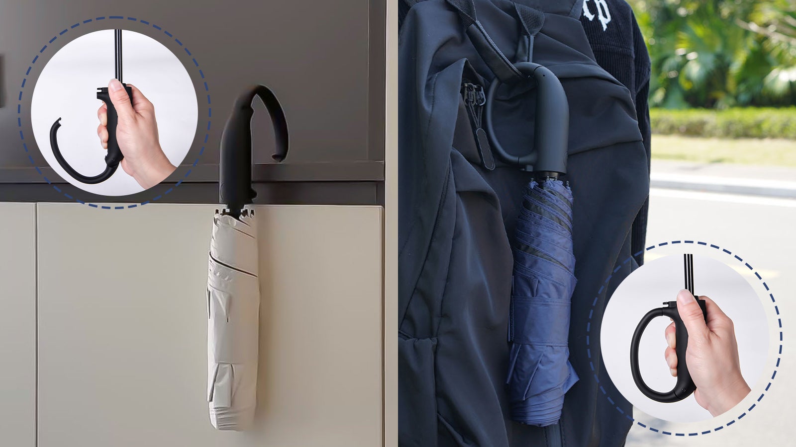 A. 傘の持ち手に付いているフックを使えば、リュックやトートバッグのストラップ部分に簡単に引っ掛けることができます。両手が自由になるため、移動時にも便利です。さらに、フックを開いた状態にすると、従来のJ型ハンドルのように玄関やテーブルなどに掛けることもできます。