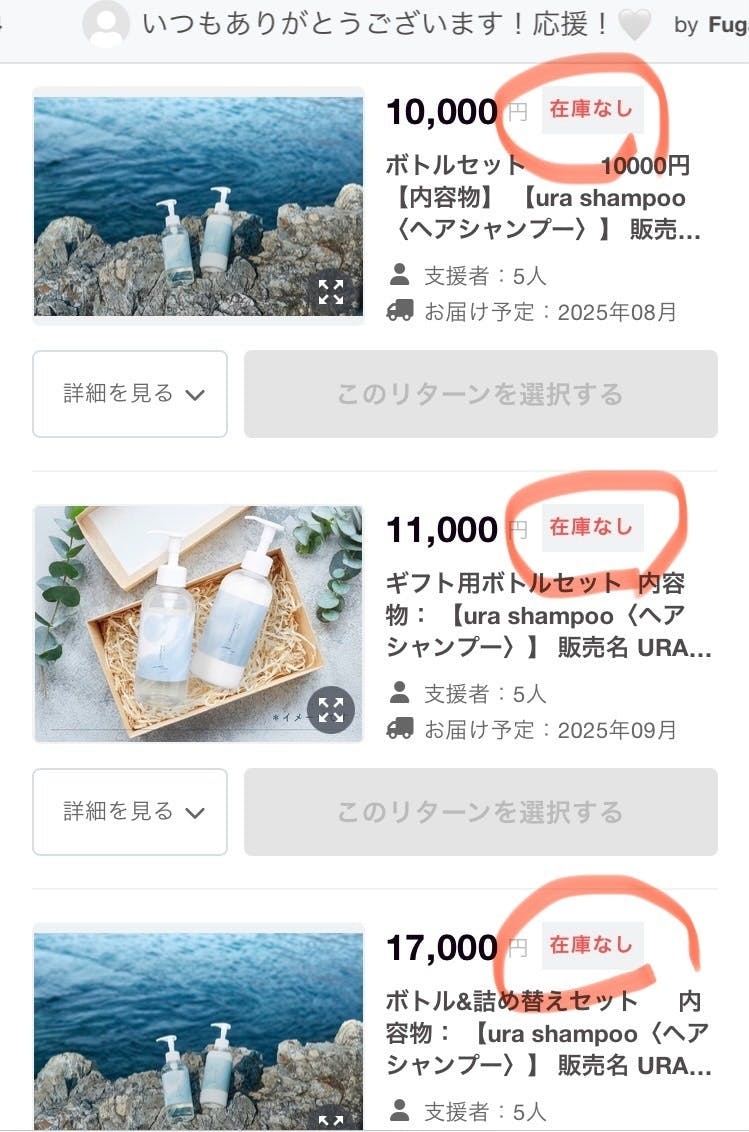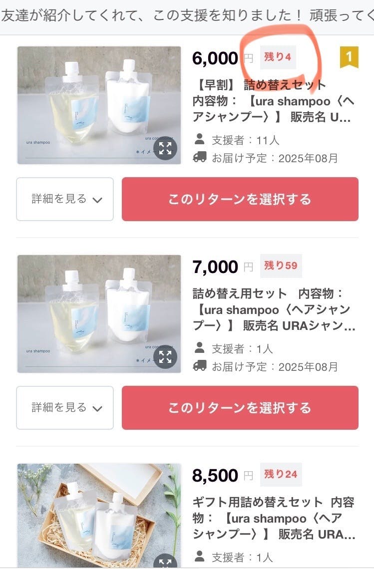 みなさまのご支援により、ボトルセットを含めたリターンは4種類あるのですが、そのうち3種類は「在庫なし」となりました!ボトルセットの入ったリターンは残り1種類の在庫4セットのみ。