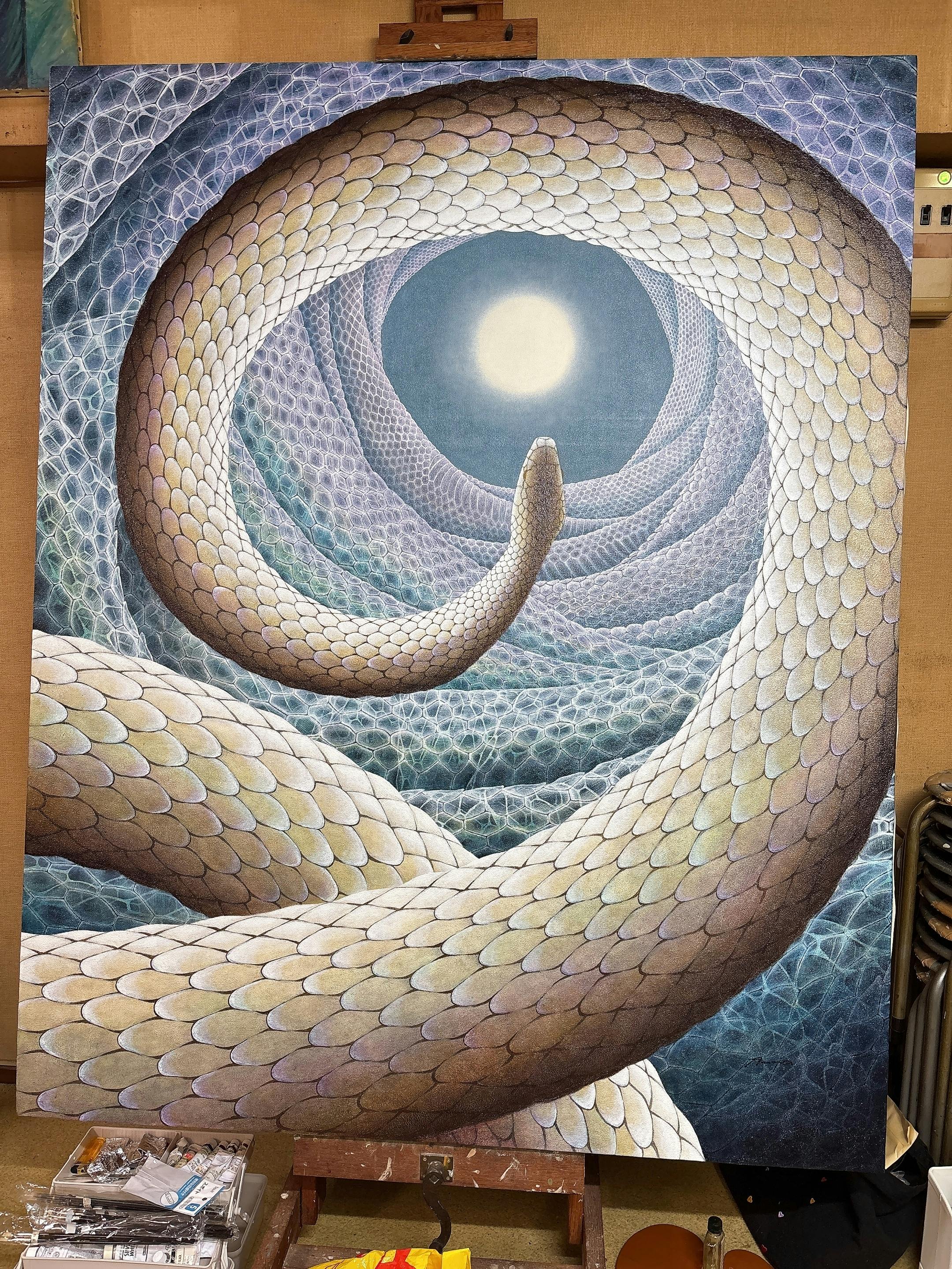 公募展へ出品する大きな作品については、蛇の絵を描いています。蛇の絵を通して、生きること、死ぬこと、そして別れてしまった人とまた出会えますようにという、邂逅への願いを伝えたい思いで描いています。画像1、2枚目の絵は完成予定のもので、こちらを100号のキャンバスへ油彩画で描きます。3、4枚目の絵は過去の作品です。