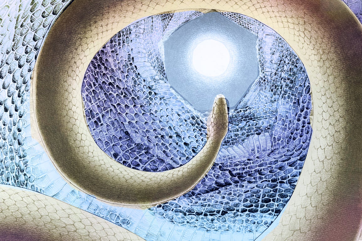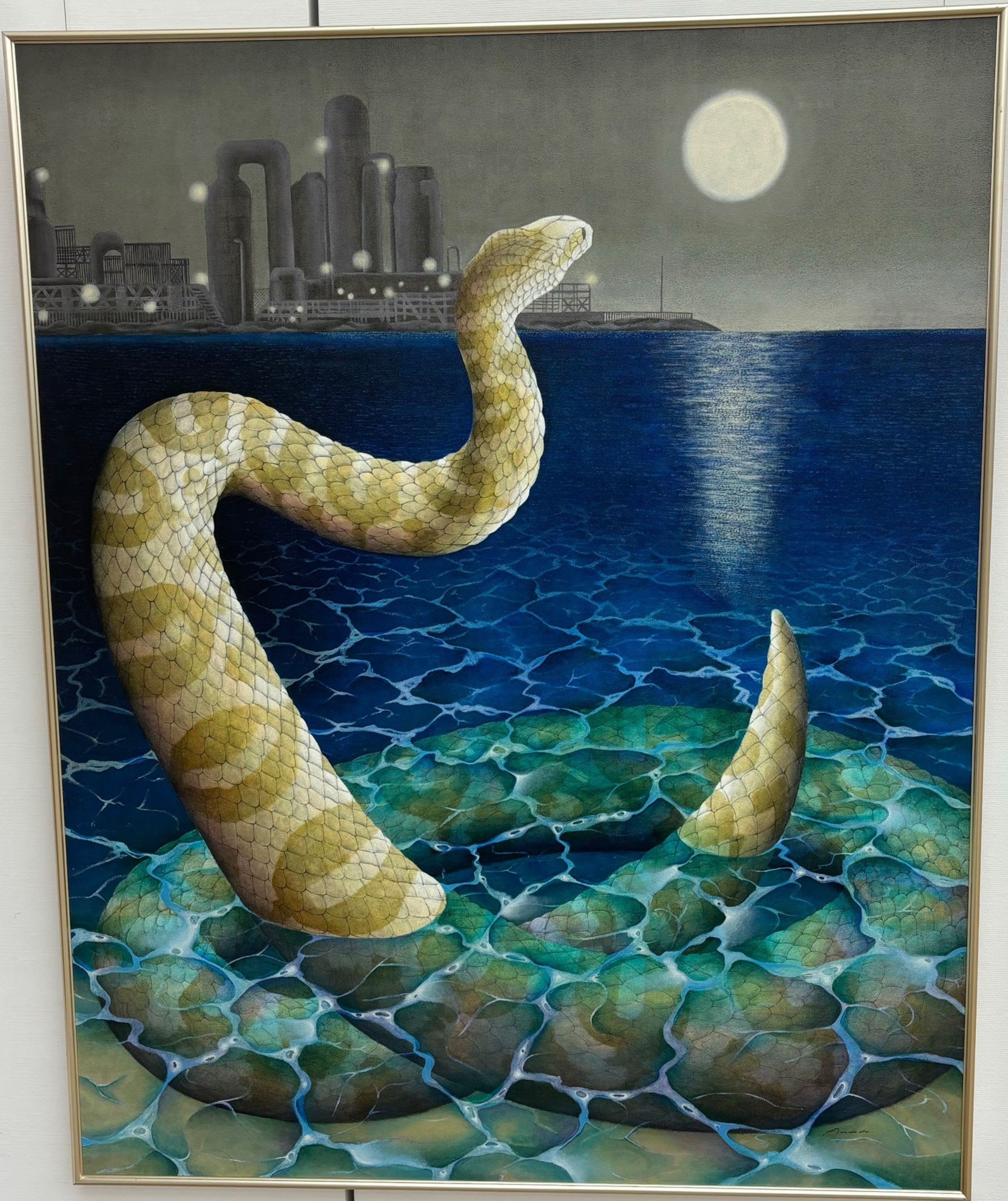 公募展へ出品する大きな作品については、蛇の絵を描いています。蛇の絵を通して、生きること、死ぬこと、そして別れてしまった人とまた出会えますようにという、邂逅への願いを伝えたい思いで描いています。画像1、2枚目の絵は完成予定のもので、こちらを100号のキャンバスへ油彩画で描きます。3、4枚目の絵は過去の作品です。