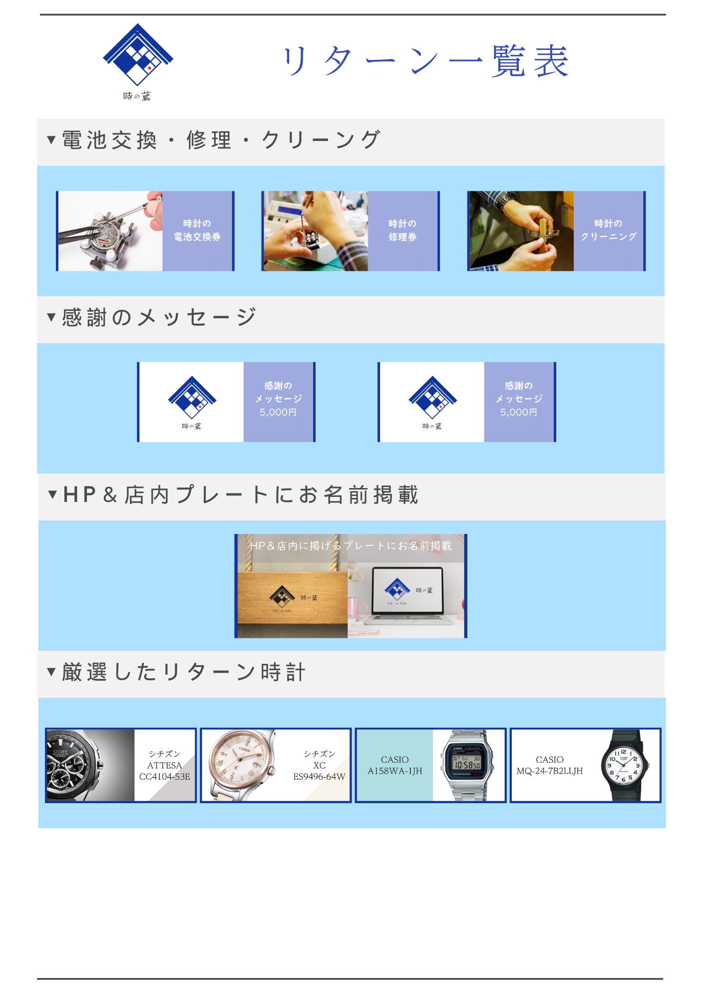 時計修理工房としてのリターンを多数用意させていただきました。