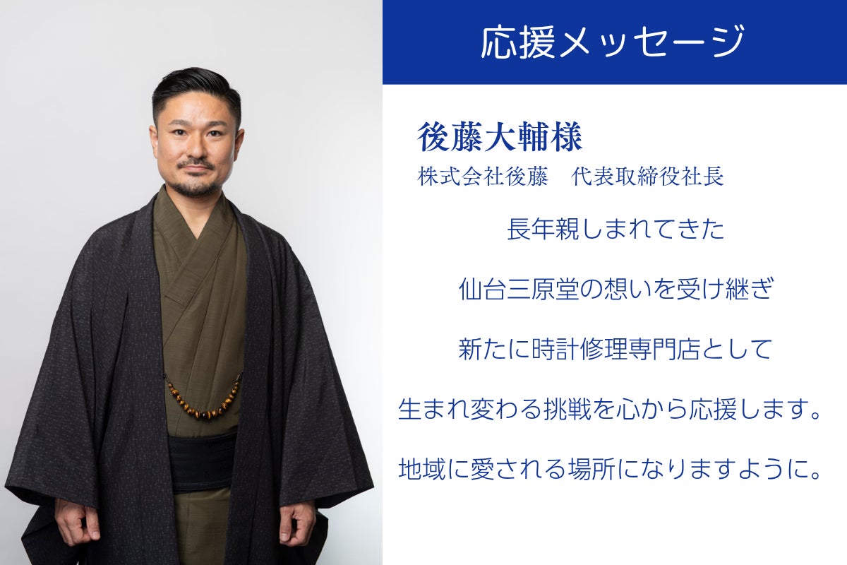 時の蔵は、仙台の地で長く愛された時計店「三原堂」で技術を磨いてきた私が、新たに立ち上げる小さな工房です。先輩方が作り上げてきた93年間の歴史に深い敬意と感謝を抱きつつ、今度は私たちが、皆さまの大切な時計と想い出を未来へつなぐ番だと覚悟して修理工房を開きたいと思います。
