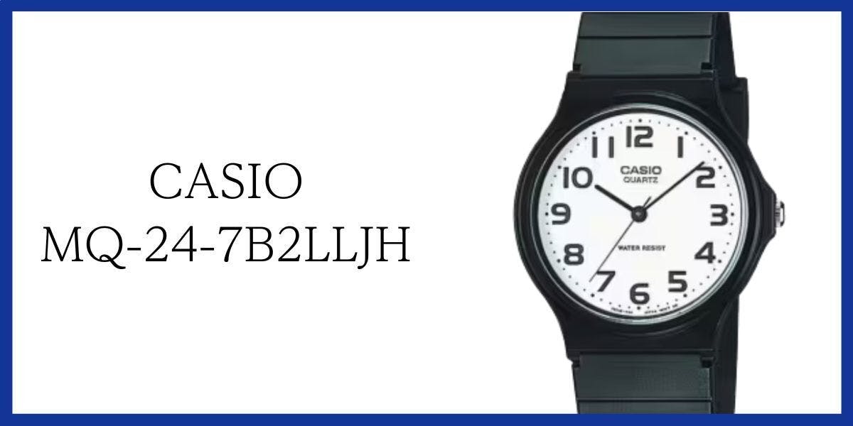 MQ-24-7B2LLJHは、無駄を削ぎ落としたミニマルなデザインが特徴です。白い文字盤にブラックの針とインデックスという、最もベーシックな組み合わせが、どんなコーディネートにも自然に馴染みます。