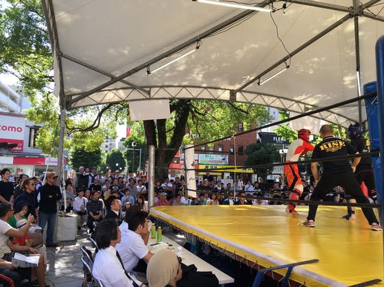 福岡に戻って約2年半で気付いたこと、それはキックボクシングという競技の認知度が低いこと、そして、都市化が進み福岡市南区の西鉄大橋駅界隈ですら賑わいが減ってきていることでした。これらの課題を解決するため、全国的なキックボクシング団体と地域の商店街コミュニティに協力いただき、今年の10月10日(祝・月)に西鉄大橋駅の駅前広場で屋外キックボクシング大会を開催することとなりました。