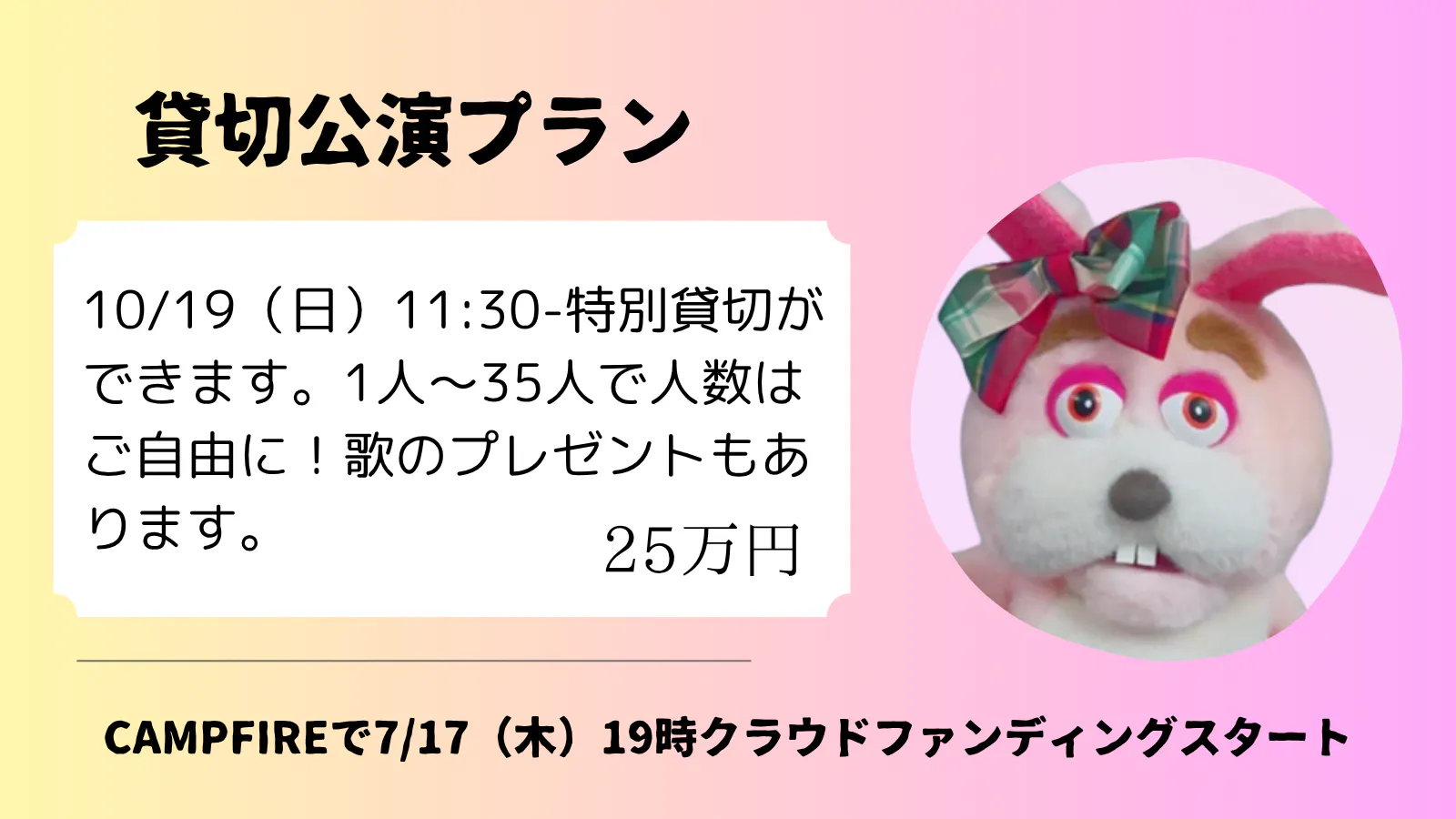 19日特別公演(11:30-)を貸切していただけるプランもあります。こちらはキャスト挨拶や歌のプレゼントもございます。