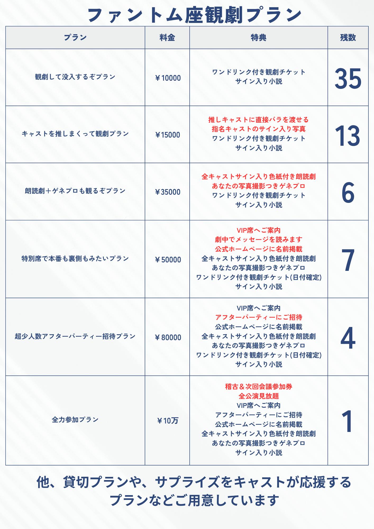 現在の観劇チケット付きリターンの詳細と残数をお知らせいたします。