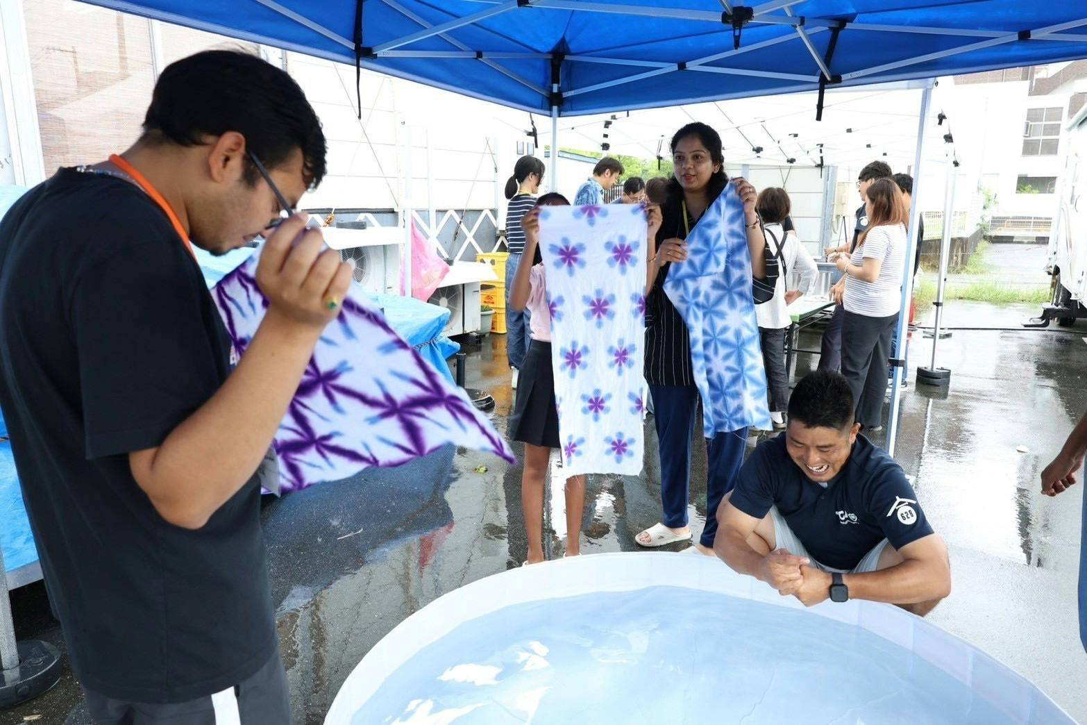 絞り染めは、布を畳んだ状態で染め、洗う際に初めて広げるため、その瞬間までどんな模様になるかは分かりません。広げた瞬間、参加者の皆さんからは「わぁ!」「かわいい!」「すごい!」と歓声があがり、会場は大盛り上がり。笑顔と笑い声があふれる、とても楽しい時間となりました。