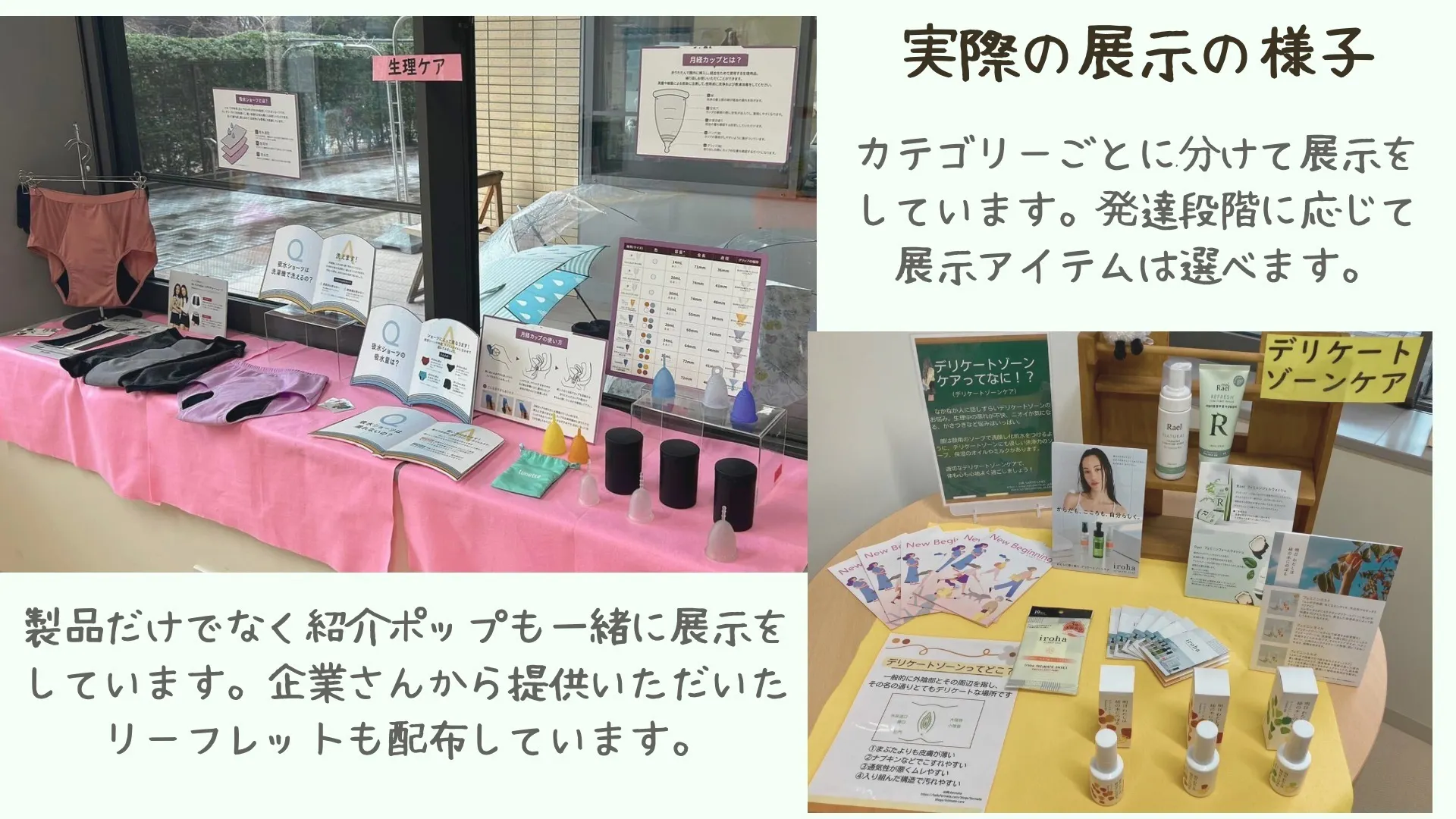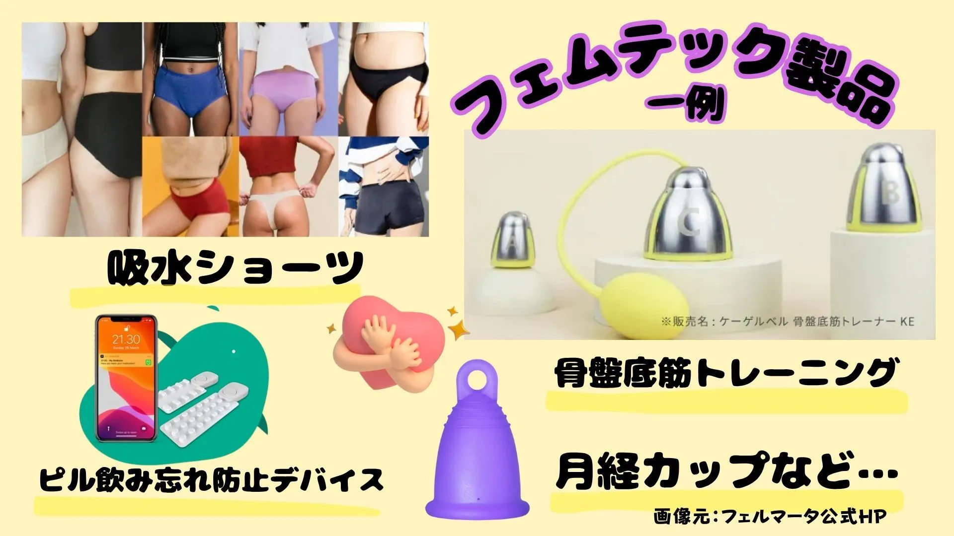 • フェムテック製品(吸水ショーツ、月経カップ、温活グッズ、生理記録アイテム など)