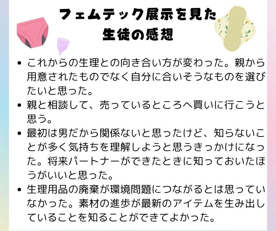 そこで私たち養護教諭は、保健室という誰もがふらっと立ち寄れる場に、フェムテック・メンテック製品と正しい情報をセットで届け「安心して学べる環境」を作ることを考えました。実際に「見て・触れて・話して・考える」体験を通じて、子どもたちが自分の体や心について学び、“選べる力”を育んでいける仕掛けを作りたいと思いました。