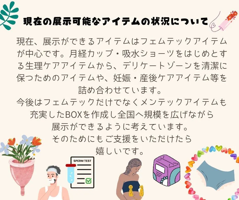 このBOXを保健室に設置し、養護教諭を通して、子どもたちに思春期特有の悩みや性についての正しい知識理解ができるように考えました。実際の製品を教材とし、多くの子どもたちが安心して学び、正しい情報を得られる環境をつくります。保健室BOXを全国の学校へ届けるために、クラウドファウンディングに挑戦したいと思います。
