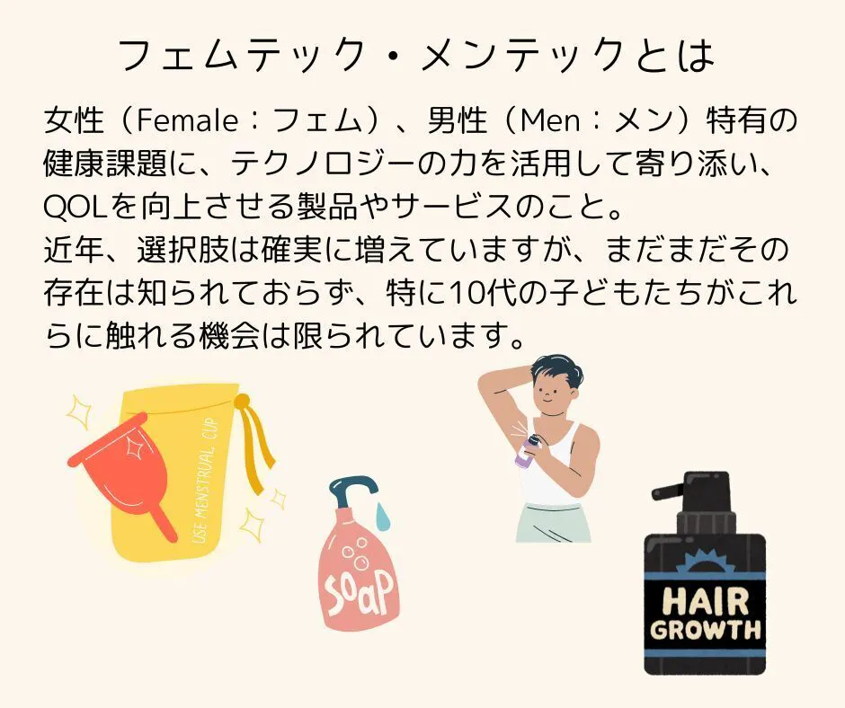 科学や医学に限らず、最近のテクノロジーの進化は著しく、子どもたちの健康に資する新しい考え方や方法が提案され、また新しい道具や機器、薬なども次々に開発されています。また、子どもたちが必ず大きな関心を持つ「性」に関連する分野には、女性を対象の中心としたフェムテックという言葉、男性にはメンテックという言葉が使われ、さまざまな製品が販売されるようになりました。