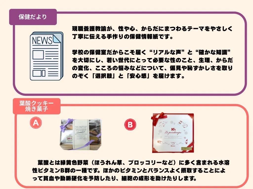 保健室を通じ、性や体の悩みを自然に話せる空気をつくり、 誰にも言えなかった不安や疑問を話せる場にしたいと思います。