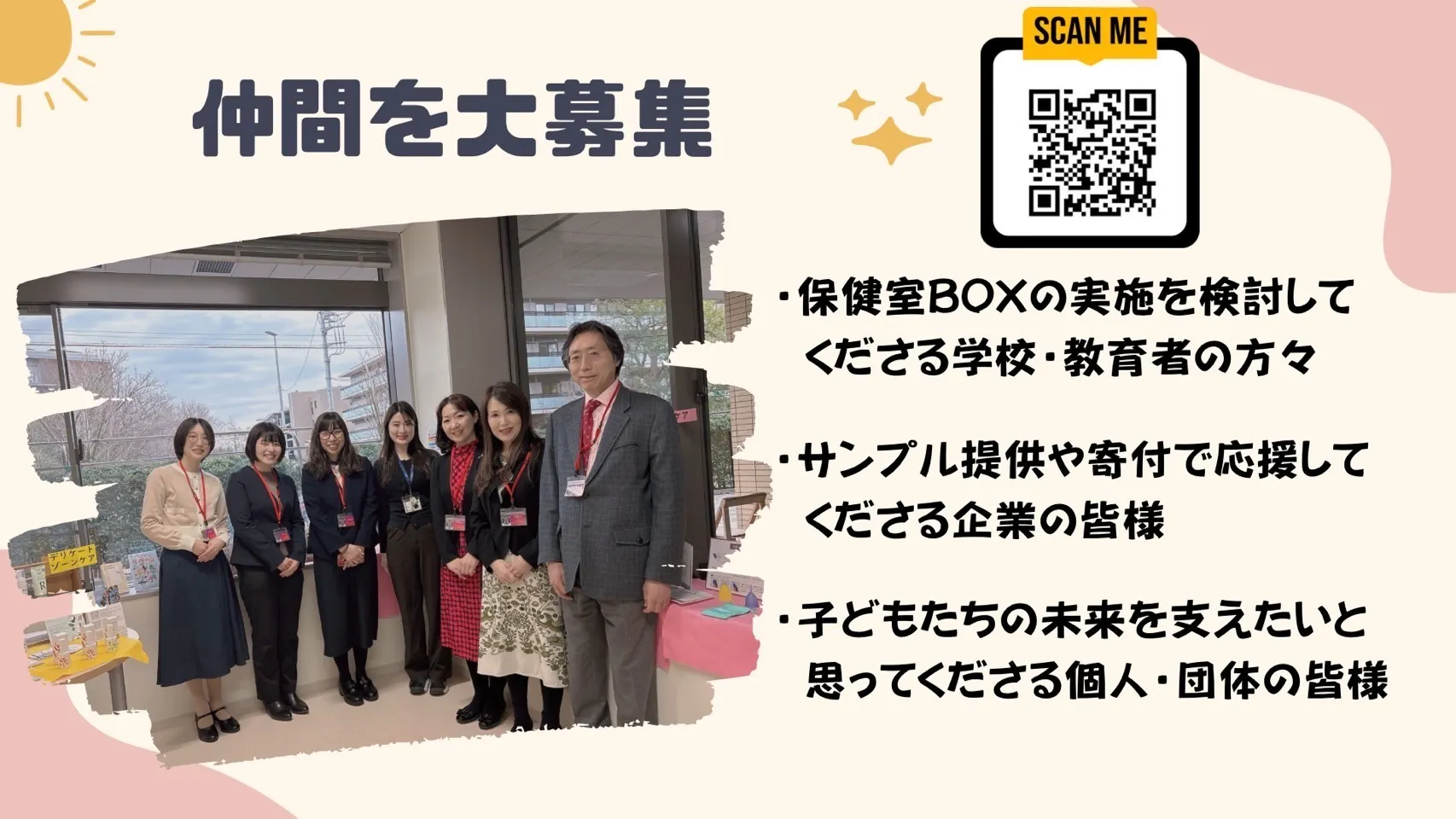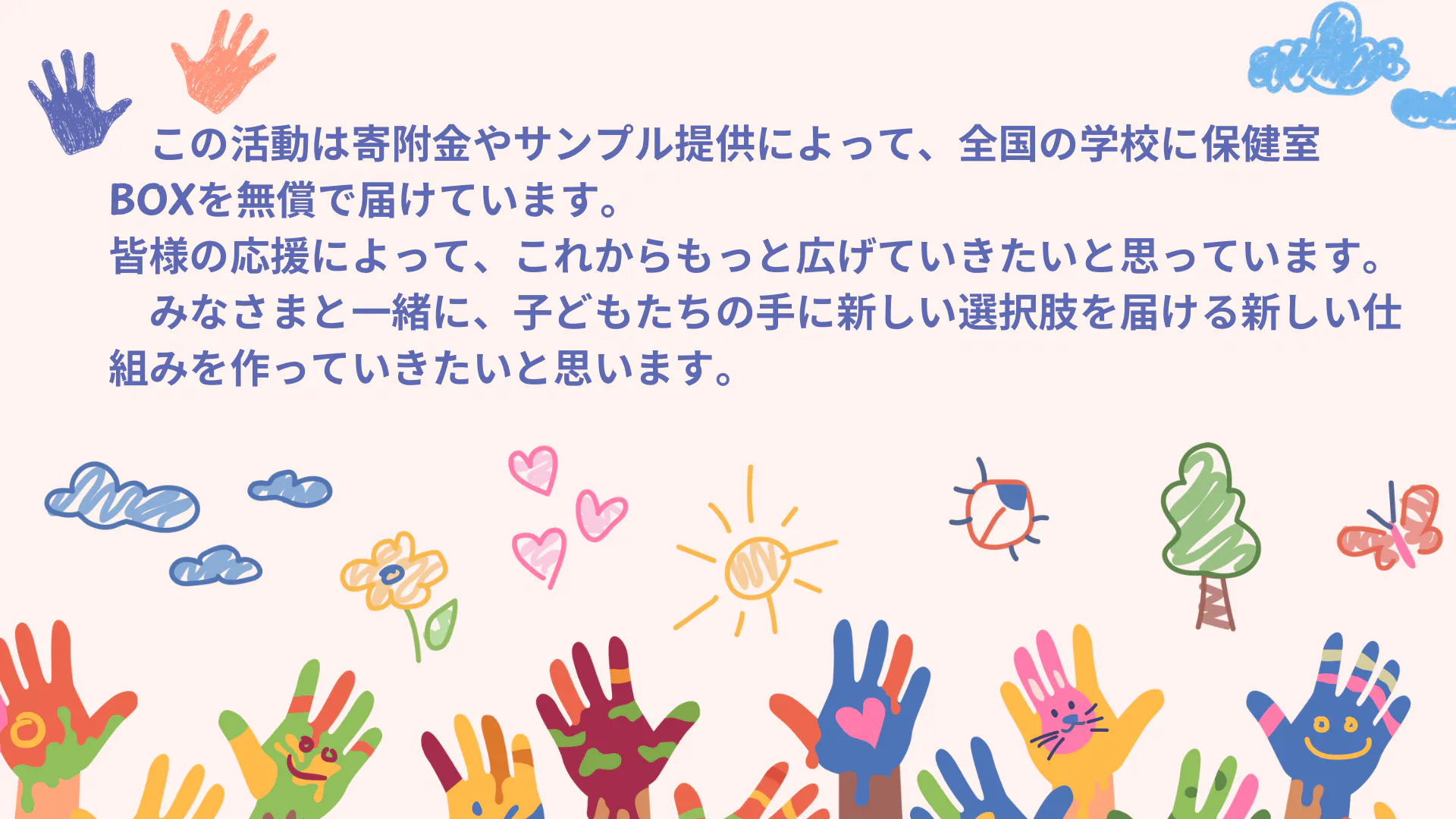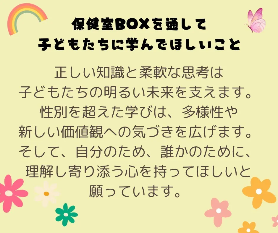 保健室BOXを通じて、子どもたち自身はもちろん、家族や周囲の人たちの健康にも関心が広がるような社会を目指していきたいと思います。