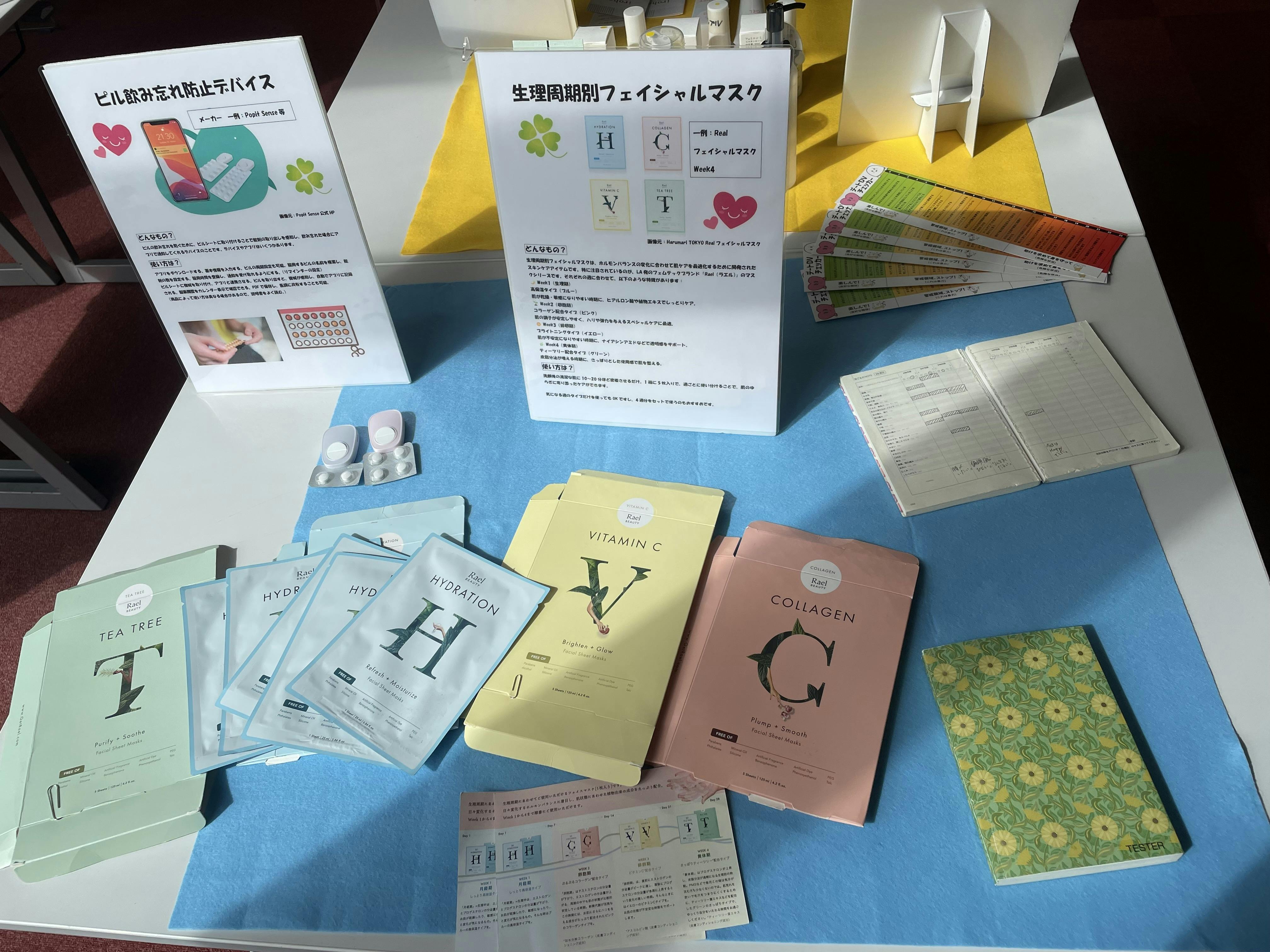 2025/10/22 23:51保健室BOXの中身紹介をします!今回は心と体のケアについてです。生理周期に合わせたフェイシャルシートマスク女性の変化するホルモンバランスに合わせて変化する体に寄り添ったフェイシャルシートマスクです。生理周期に合わせて使える製品です!からだみつめるノート&カラダみつめる手帳からだみつめるノートは自分の体について記録ができるノートです。最近は体調などをアプリなどでも手軽に管理ができたりしますが、病院受診時にはアプリだと伝えにくい場合もあります。さっとお医者さんに見せられるところはノートの良さだと思います。カラダみつめる手帳は、女性特有の不調を言語化したような手帳になっています。女性は読むことで自分に起きる不調に対して対策することや、ホルモンバランスで起きる不調であることに気づけたりします。また、男性にもこの手帳を読んでもらうことをお勧めしたいです。女性の不調を理解するきっかけなるので、是非読んで欲しいと思います。実際に展示に参加された娘さんを持つお父さんが、この手帳を手に取り娘の不調を理解するために必要だと思ったと感想をくださった方もいらっしゃいました。次回は妊娠•産後ケアについてご紹介します!お楽しみに! もっと見る