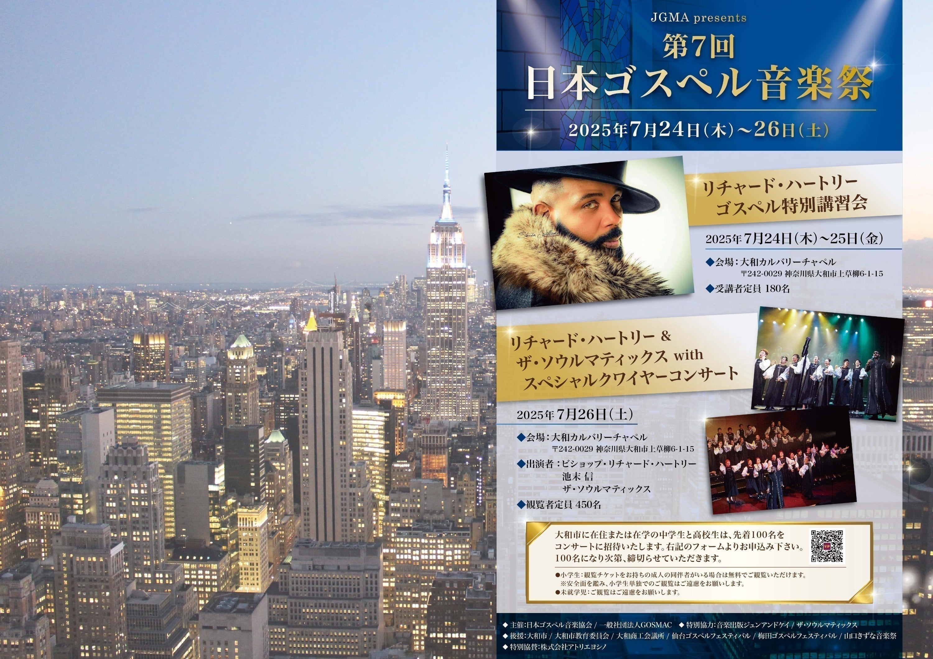 今回のプロジェクト「リチャード・ハートリー特別講習会」ならびに「リチャード・ハートリー & ザ・ソウルマティックス with スペシャルクワイヤー」の座組は次のようになっています。主催:日本ゴスペル音楽協会 / 一般社団法人GOSMAC 特別協力:音楽出版ジュンアンドケイ / ザ・ソウルマティックス 後援:大和市 / 大和教育委員会 / 大和商工会議所 / 仙台ゴスペルフェスティバル / 梅田ゴスペルフェスティバル / 山口きずな音楽祭 特別協賛:株式会社アトリエヨシノ