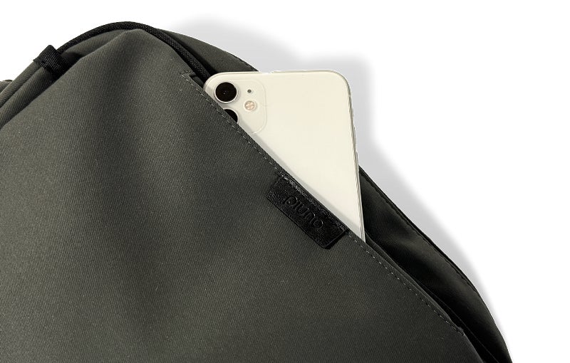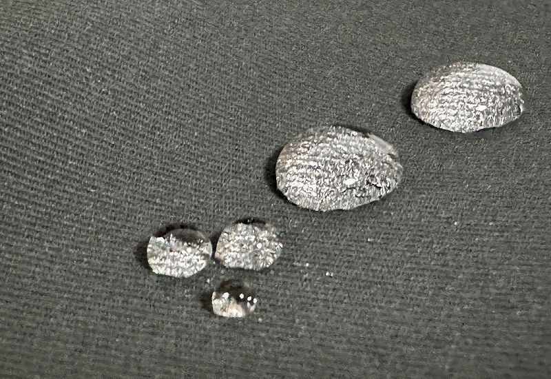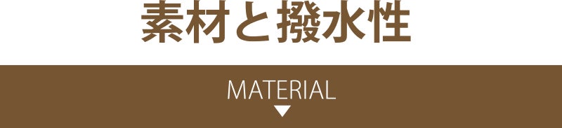 キャンバスのような落ち着いた風合いの柔らかいポリエステル素材で、撥水加工を施しているので、濡れた時でもサッと叩くだけで水滴がはじけてくれます。