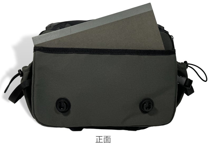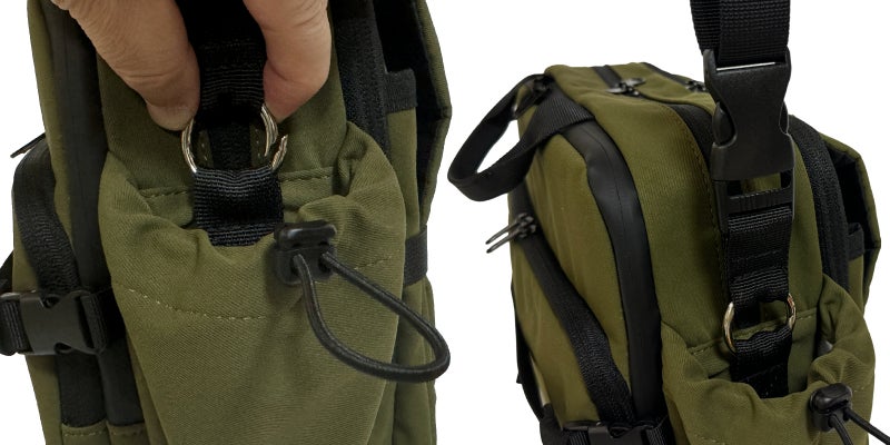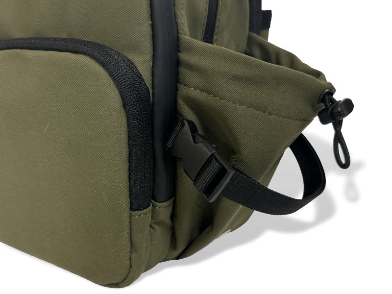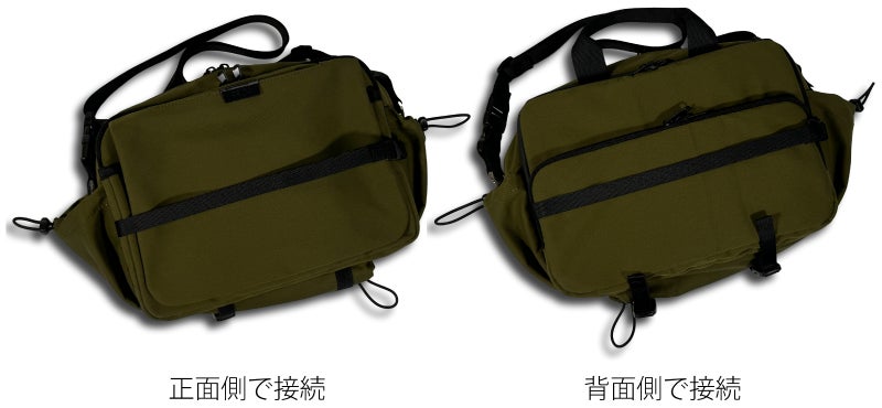 両サイドのポケット周りに装備したストラップは下記画像のようにバッグ正面側と背面側に接続できるようになっています。