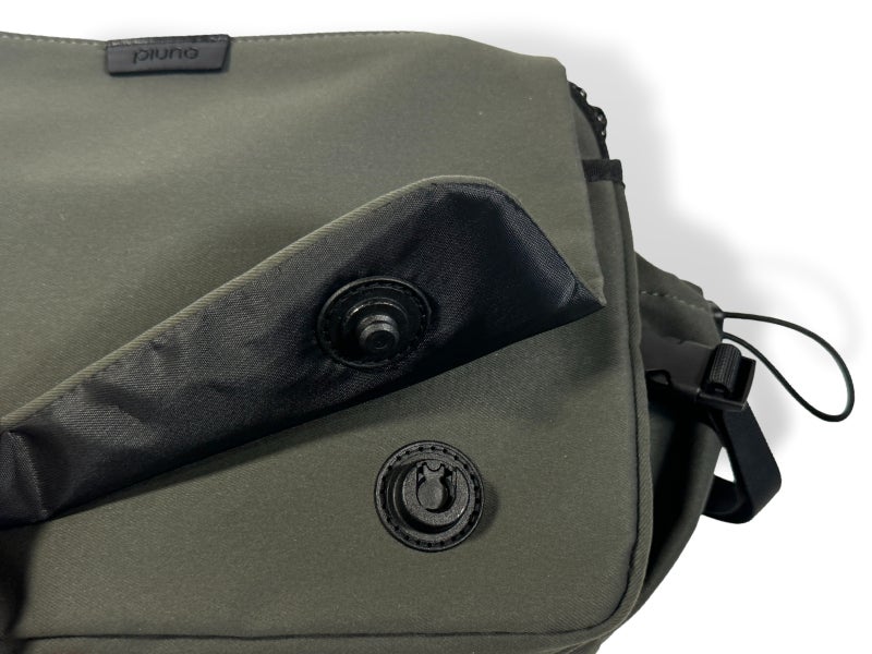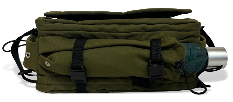バッグの底面には折りたたみ傘を収納できるポケットと調節可能な2本のストラップが付いています。内側の素材はボトルホルダー同様に水を弾くPVCを採用し、湿気を放出するための鳩目ホールも付けました。