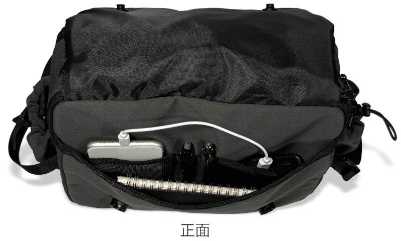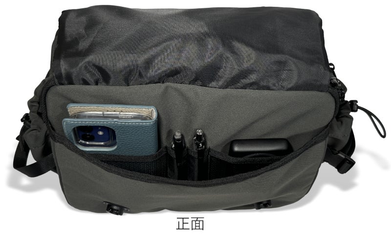 このフラップを開けると2つ目の収納スペースがあり、スマホやモバイルバッテリー、カードケースが入るサイズのメッショポケットとペン差しを完備しています。