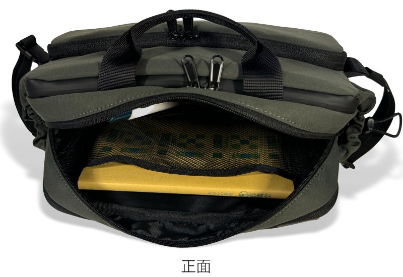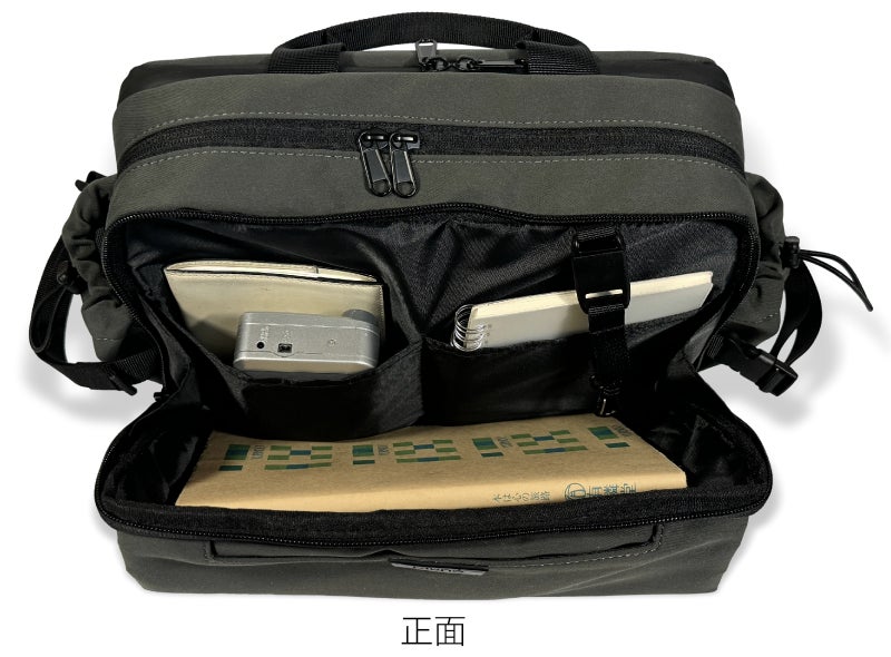 3つ目の収納スペースは、ガバッと開くスペースでこぼれ落ち防止の三角マチが付いています。デジカメやA6サイズのミニノートが入る大き目のポケットを装備しています。