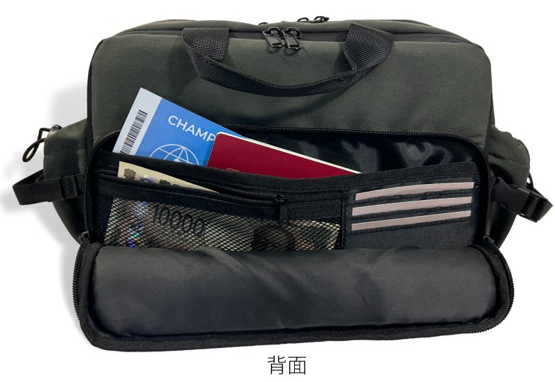身体に当たるバッグの最背面にある6つ目の収納スペースは、セキュリティーポケットとして利用いただけます。大切なパスポートやカード類など、お財布のように活用できるよう構成されています。