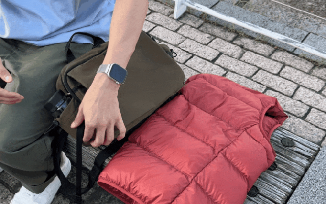 2本のストラップベルトは長さ調節が可能で、カメラ用三脚やライトダウンくらいならクルクル巻いて固定することも出来ます。
