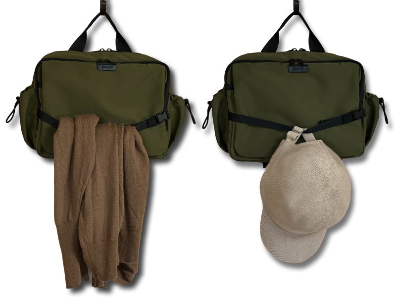 ストラップを正面で繋いだ時は、画像のように羽織物や帽子を掛けたりすることが出来るので、出先で両手を空けておきたい時に便利です。