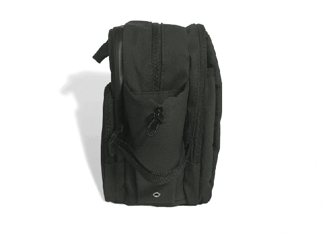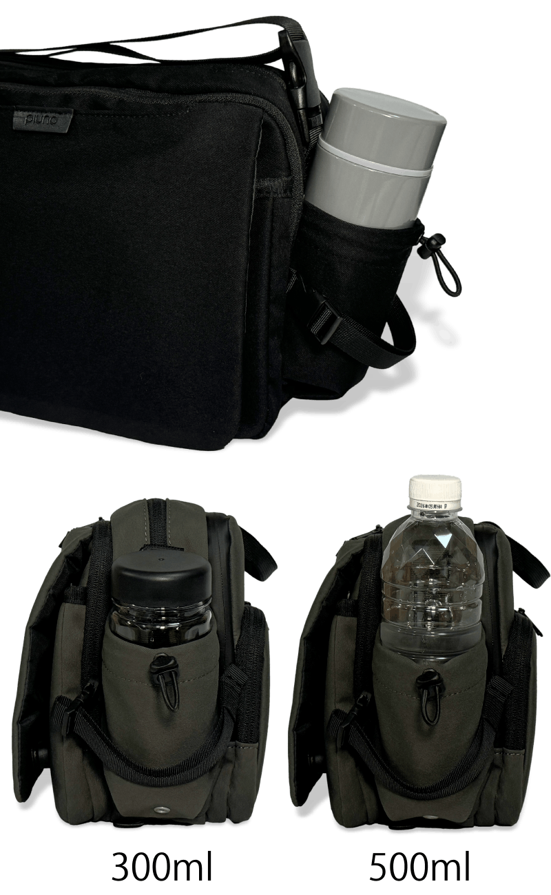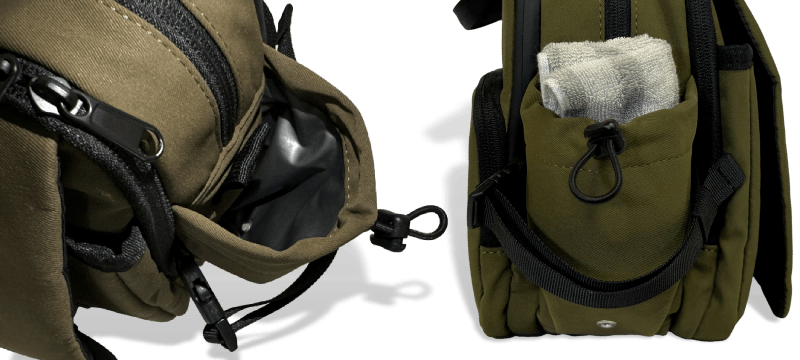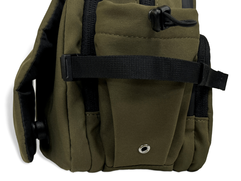 バッグの両側面にはボトルや小物が入るポケットが付いています。ポケット裏側には水を弾くPVC素材をし、水気を放出するための鳩目ホールを付けました。