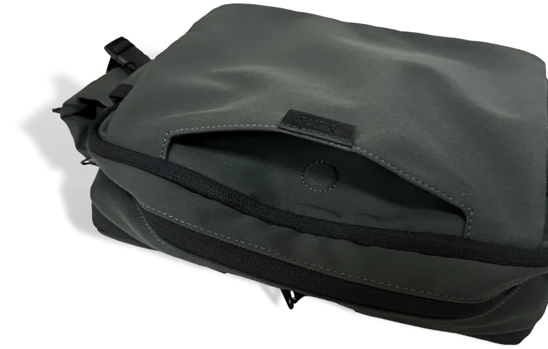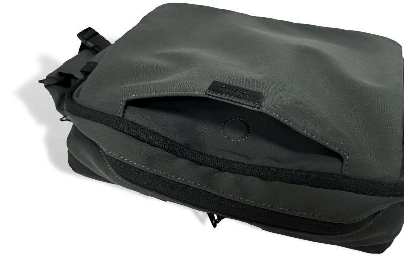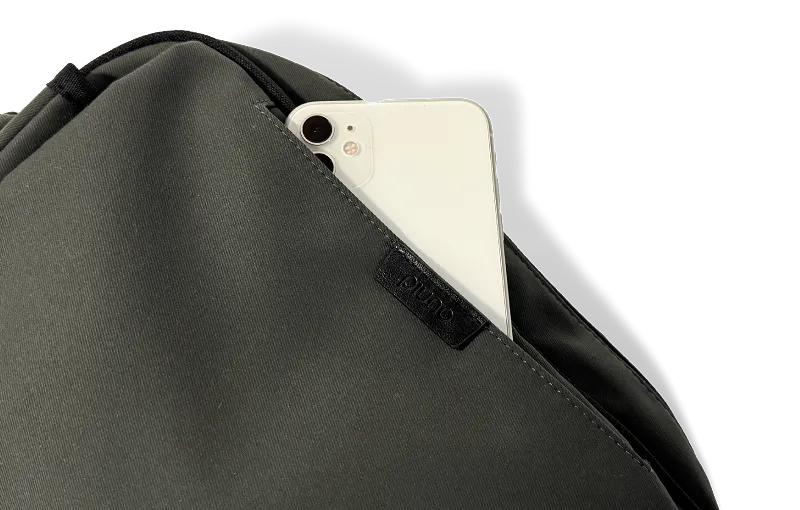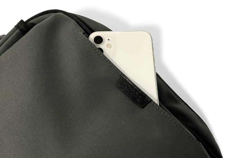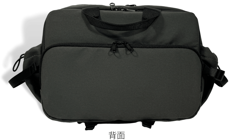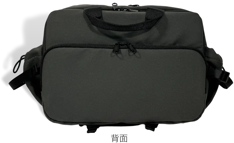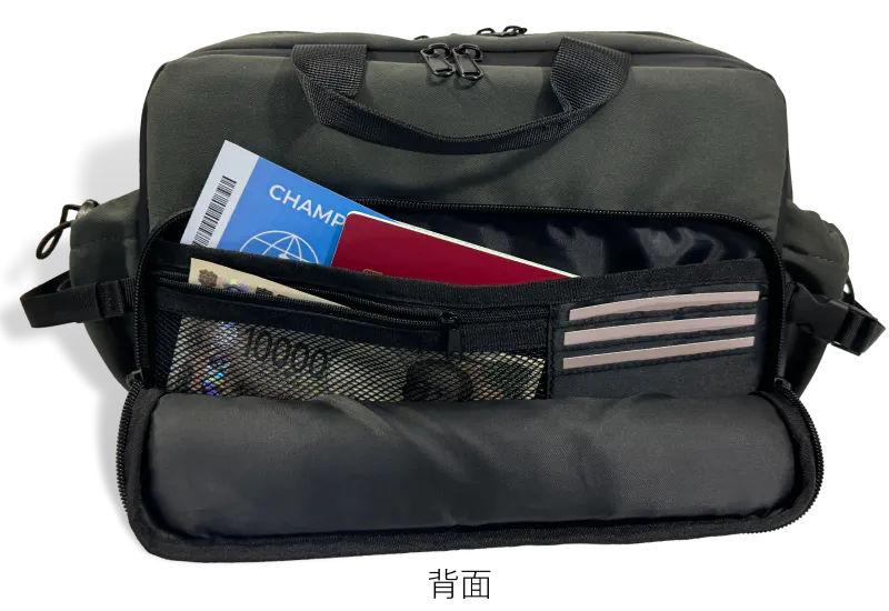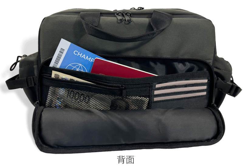 身体に当たるバッグの最背面にある6つ目の収納スペースは、セキュリティーポケットとして利用いただけます。大切なパスポートやカード類など、お財布のように活用できるよう構成されています。