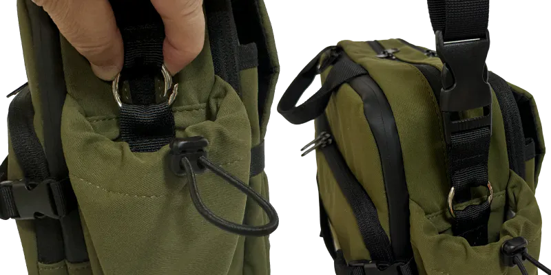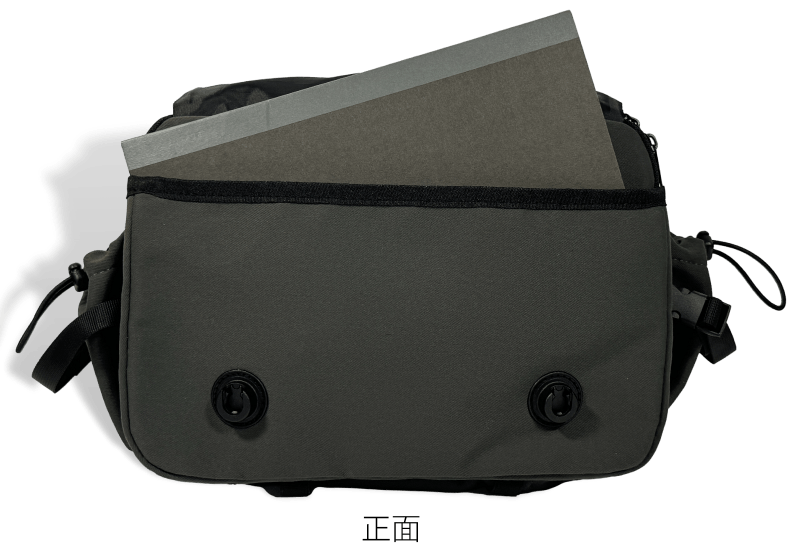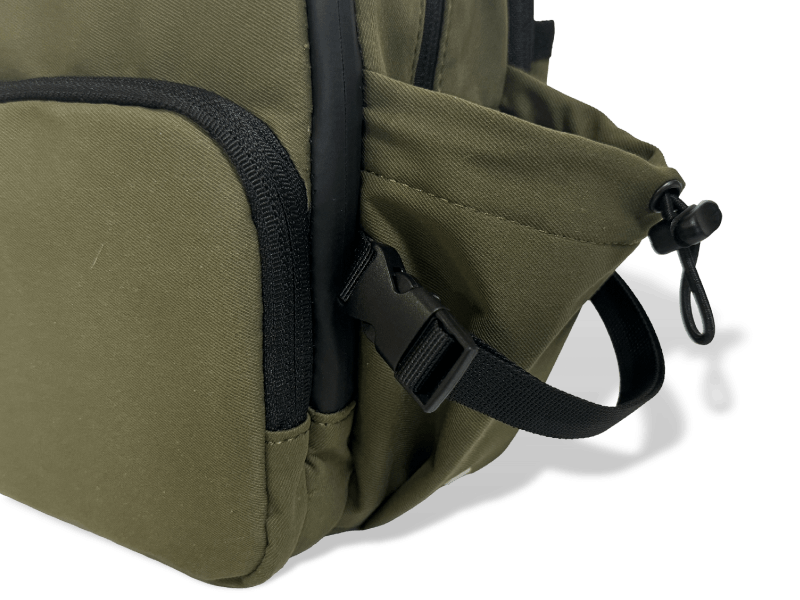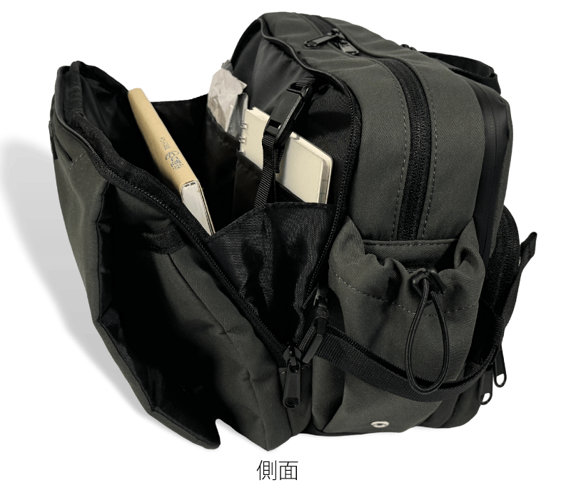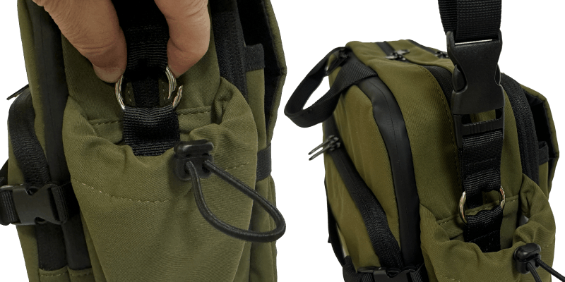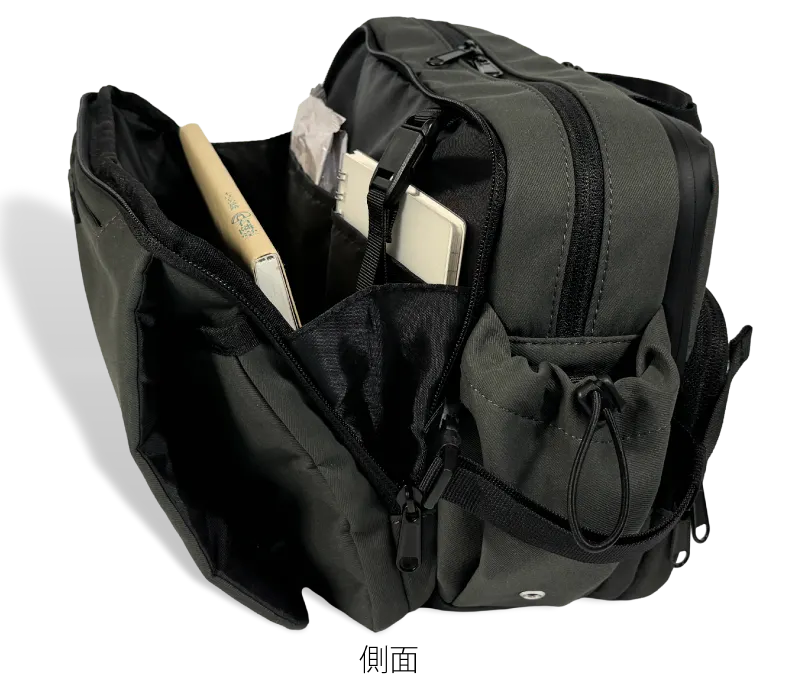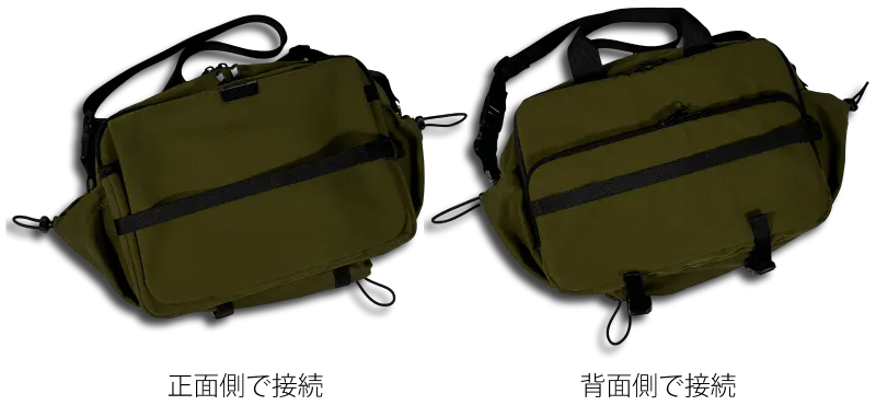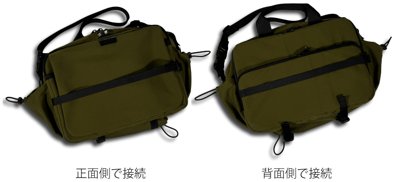 両サイドのポケット周りに装備したストラップは下記画像のようにバッグ正面側と背面側に接続できるようになっています。
