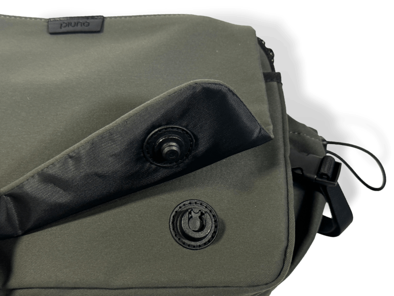 開閉は特殊なマグネットボタンを採用しており、閉める時はカチッと自動で固定してくれ、開ける時は通常のマグネットボタンと違い、少し上にスライドしないと外れない仕様になっているのでセキュリティー面も考慮しています。