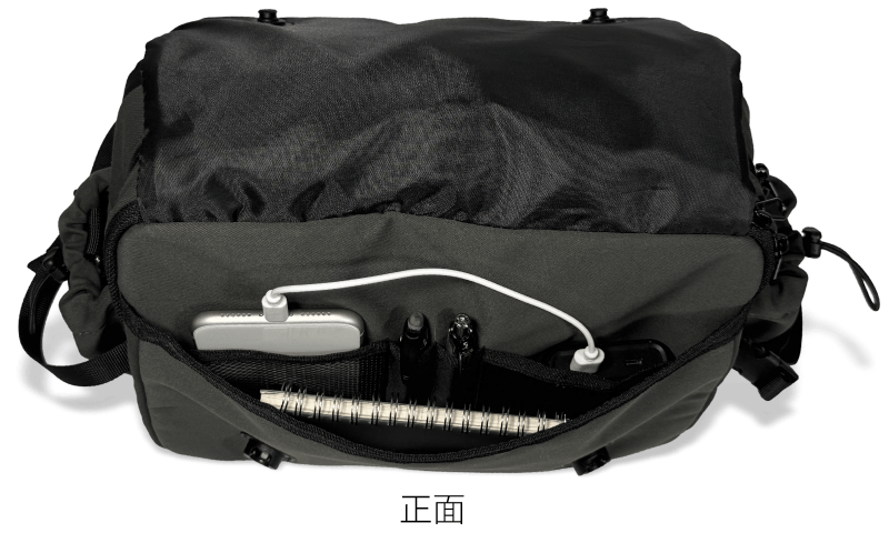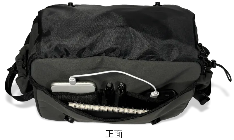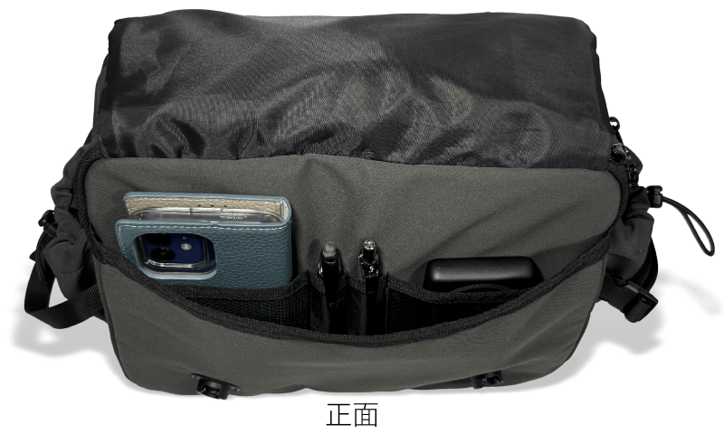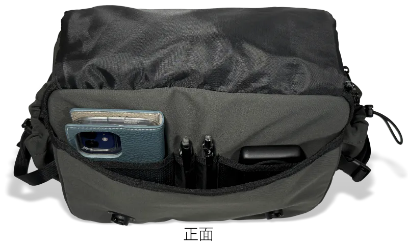 このフラップを開けると2つ目の収納スペースがあり、スマホやモバイルバッテリー、カードケースが入るサイズのメッショポケットとペン差しを完備しています。