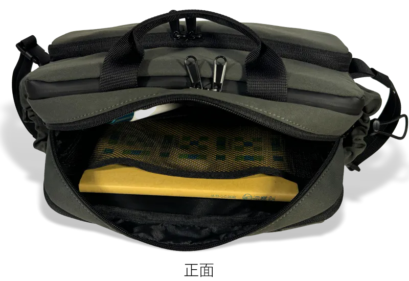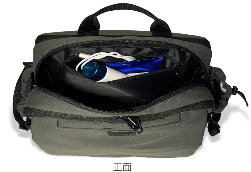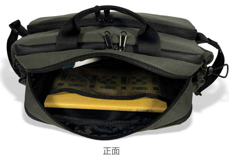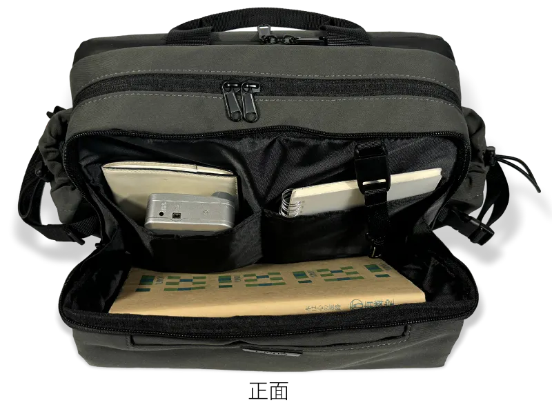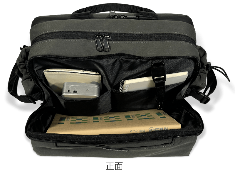 3つ目の収納スペースは、ガバッと開くスペースでこぼれ落ち防止の三角マチが付いています。デジカメやA6サイズのミニノートが入る大き目のポケットを装備しています。
